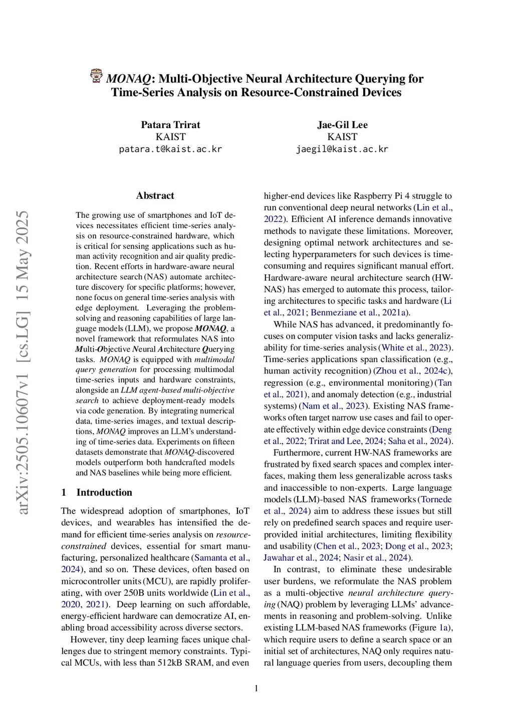 The growing use of smartphones and IoT devices necessitates efficient time-series analysis on resource-constrained hardware, which is critical for sensing applications such as human activity recognition and air quality prediction. Recent efforts in hardware-aware neural architecture search (NAS) automate architecture discovery for specific platforms; however, none focus on general time-series analysis with edge deployment. Leveraging the problem-solving and reasoning capabilities of large language models (LLM), we propose MONAQ, a novel framework that reformulates NAS into Multi-Objective Neural Architecture Querying tasks. MONAQ is equipped with multimodal query generation for processing multimodal time-series inputs and hardware constraints, alongside an LLM agent-based multi-objective search to achieve deployment-ready models via code generation. By integrating numerical data, time-series images, and textual descriptions, MONAQ improves an LLM's understanding of time-series data. Experiments on fifteen datasets demonstrate that MONAQ-discovered models outperform both handcrafted models and NAS baselines while being more efficient.