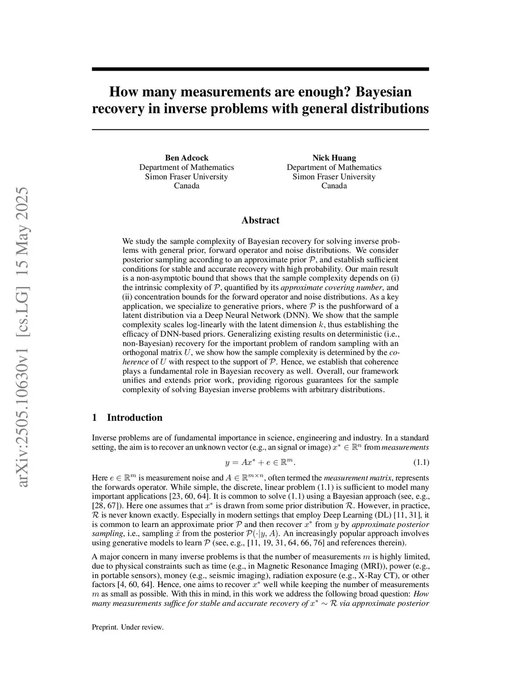 We study the sample complexity of Bayesian recovery for solving inverse problems with general prior, forward operator and noise distributions. We consider posterior sampling according to an approximate prior , and establish sufficient conditions for stable and accurate recovery with high probability. Our main result is a non-asymptotic bound that shows that the sample complexity depends on (i) the intrinsic complexity of , quantified by its so-called approximate covering number, and (ii) concentration bounds for the forward operator and noise distributions. As a key application, we specialize to generative priors, where is the pushforward of a latent distribution via a Deep Neural Network (DNN). We show that the sample complexity scales log-linearly with the latent dimension , thus establishing the efficacy of DNN-based priors. Generalizing existing results on deterministic (i.e., non-Bayesian) recovery for the important problem of random sampling with an orthogonal matrix , we show how the sample complexity is determined by the coherence of with respect to the support of . Hence, we establish that coherence plays a fundamental role in Bayesian recovery as well. Overall, our framework unifies and extends prior work, providing rigorous guarantees for the sample complexity of solving Bayesian inverse problems with arbitrary distributions.