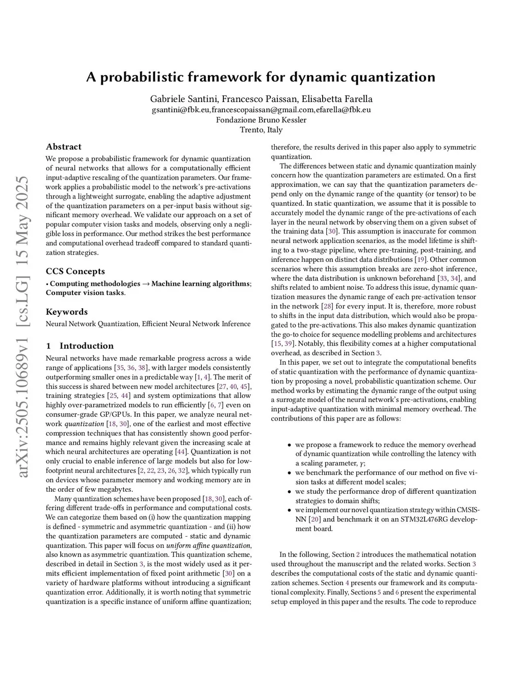 We propose a probabilistic framework for dynamic quantization of neural networks that allows for a computationally efficient input-adaptive rescaling of the quantization parameters. Our framework applies a probabilistic model to the network's pre-activations through a lightweight surrogate, enabling the adaptive adjustment of the quantization parameters on a per-input basis without significant memory overhead. We validate our approach on a set of popular computer vision tasks and models, observing only a negligible loss in performance. Our method strikes the best performance and computational overhead tradeoff compared to standard quantization strategies.