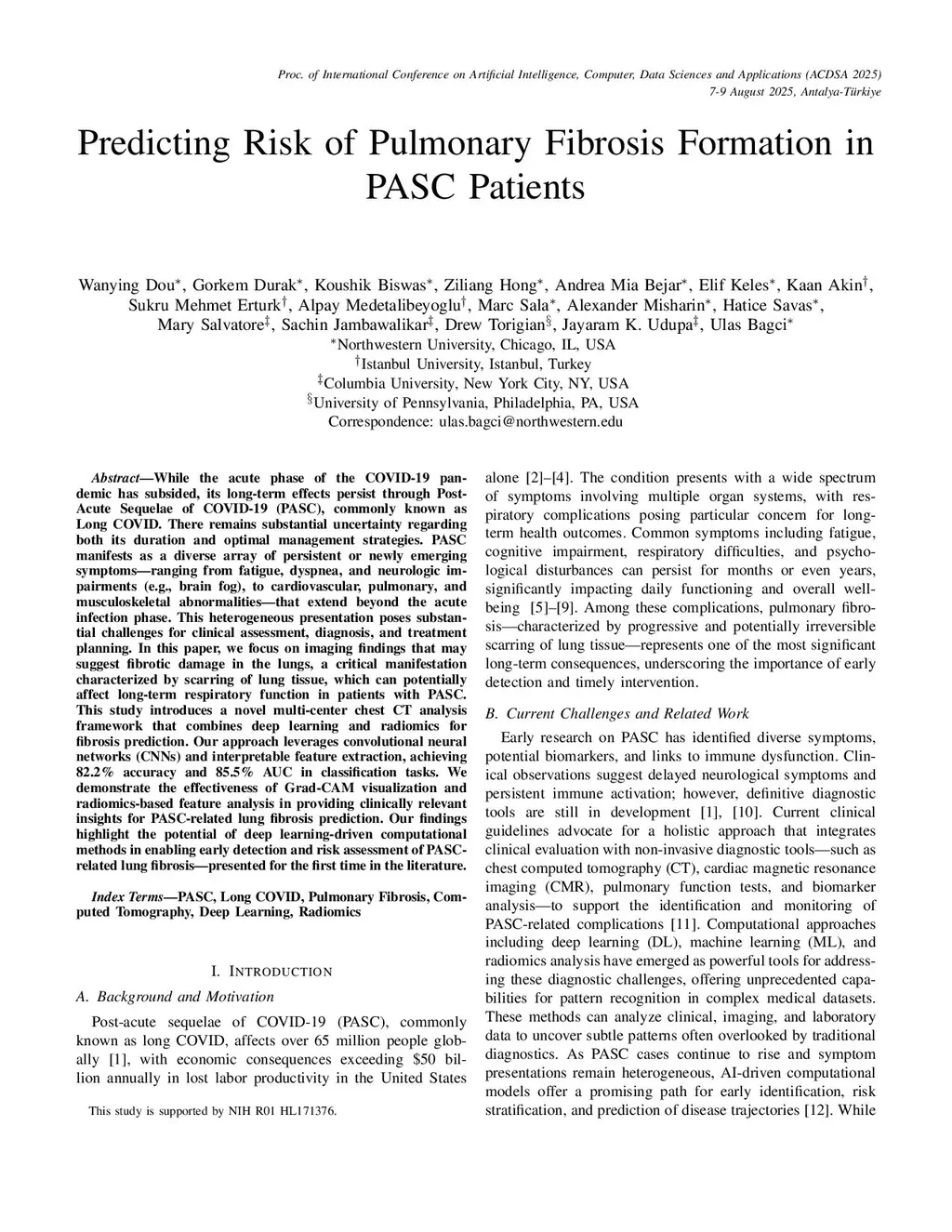 While the acute phase of the COVID-19 pandemic has subsided, its long-term effects persist through Post-Acute Sequelae of COVID-19 (PASC), commonly known as Long COVID. There remains substantial uncertainty regarding both its duration and optimal management strategies. PASC manifests as a diverse array of persistent or newly emerging symptoms--ranging from fatigue, dyspnea, and neurologic impairments (e.g., brain fog), to cardiovascular, pulmonary, and musculoskeletal abnormalities--that extend beyond the acute infection phase. This heterogeneous presentation poses substantial challenges for clinical assessment, diagnosis, and treatment planning. In this paper, we focus on imaging findings that may suggest fibrotic damage in the lungs, a critical manifestation characterized by scarring of lung tissue, which can potentially affect long-term respiratory function in patients with PASC. This study introduces a novel multi-center chest CT analysis framework that combines deep learning and radiomics for fibrosis prediction. Our approach leverages convolutional neural networks (CNNs) and interpretable feature extraction, achieving 82.2% accuracy and 85.5% AUC in classification tasks. We demonstrate the effectiveness of Grad-CAM visualization and radiomics-based feature analysis in providing clinically relevant insights for PASC-related lung fibrosis prediction. Our findings highlight the potential of deep learning-driven computational methods for early detection and risk assessment of PASC-related lung fibrosis--presented for the first time in the literature.