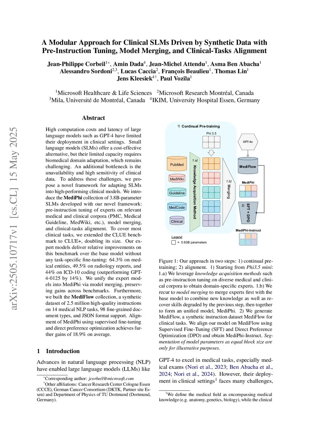 High computation costs and latency of large language models such as GPT-4 have limited their deployment in clinical settings. Small language models (SLMs) offer a cost-effective alternative, but their limited capacity requires biomedical domain adaptation, which remains challenging. An additional bottleneck is the unavailability and high sensitivity of clinical data. To address these challenges, we propose a novel framework for adapting SLMs into high-performing clinical models. We introduce the MediPhi collection of 3.8B-parameter SLMs developed with our novel framework: pre-instruction tuning of experts on relevant medical and clinical corpora (PMC, Medical Guideline, MedWiki, etc.), model merging, and clinical-tasks alignment. To cover most clinical tasks, we extended the CLUE benchmark to CLUE+, doubling its size. Our expert models deliver relative improvements on this benchmark over the base model without any task-specific fine-tuning: 64.3% on medical entities, 49.5% on radiology reports, and 44% on ICD-10 coding (outperforming GPT-4-0125 by 14%). We unify the expert models into MediPhi via model merging, preserving gains across benchmarks. Furthermore, we built the MediFlow collection, a synthetic dataset of 2.5 million high-quality instructions on 14 medical NLP tasks, 98 fine-grained document types, and JSON format support. Alignment of MediPhi using supervised fine-tuning and direct preference optimization achieves further gains of 18.9% on average.