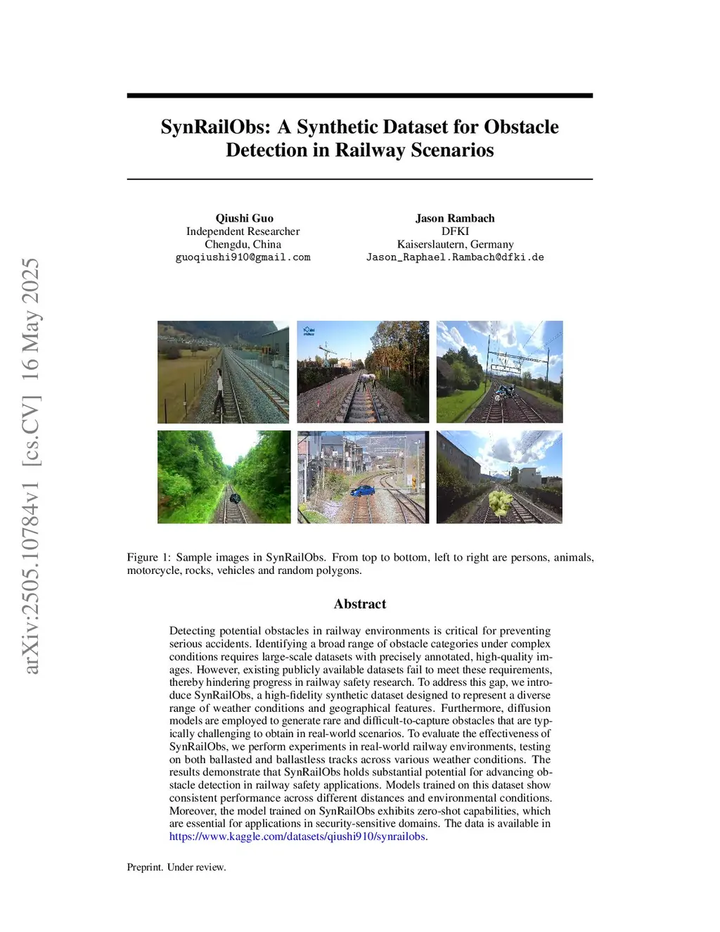 Detecting potential obstacles in railway environments is critical for preventing serious accidents. Identifying a broad range of obstacle categories under complex conditions requires large-scale datasets with precisely annotated, high-quality images. However, existing publicly available datasets fail to meet these requirements, thereby hindering progress in railway safety research. To address this gap, we introduce SynRailObs, a high-fidelity synthetic dataset designed to represent a diverse range of weather conditions and geographical features. Furthermore, diffusion models are employed to generate rare and difficult-to-capture obstacles that are typically challenging to obtain in real-world scenarios. To evaluate the effectiveness of SynRailObs, we perform experiments in real-world railway environments, testing on both ballasted and ballastless tracks across various weather conditions. The results demonstrate that SynRailObs holds substantial potential for advancing obstacle detection in railway safety applications. Models trained on this dataset show consistent performance across different distances and environmental conditions. Moreover, the model trained on SynRailObs exhibits zero-shot capabilities, which are essential for applications in security-sensitive domains. The data is available inthis https URL.