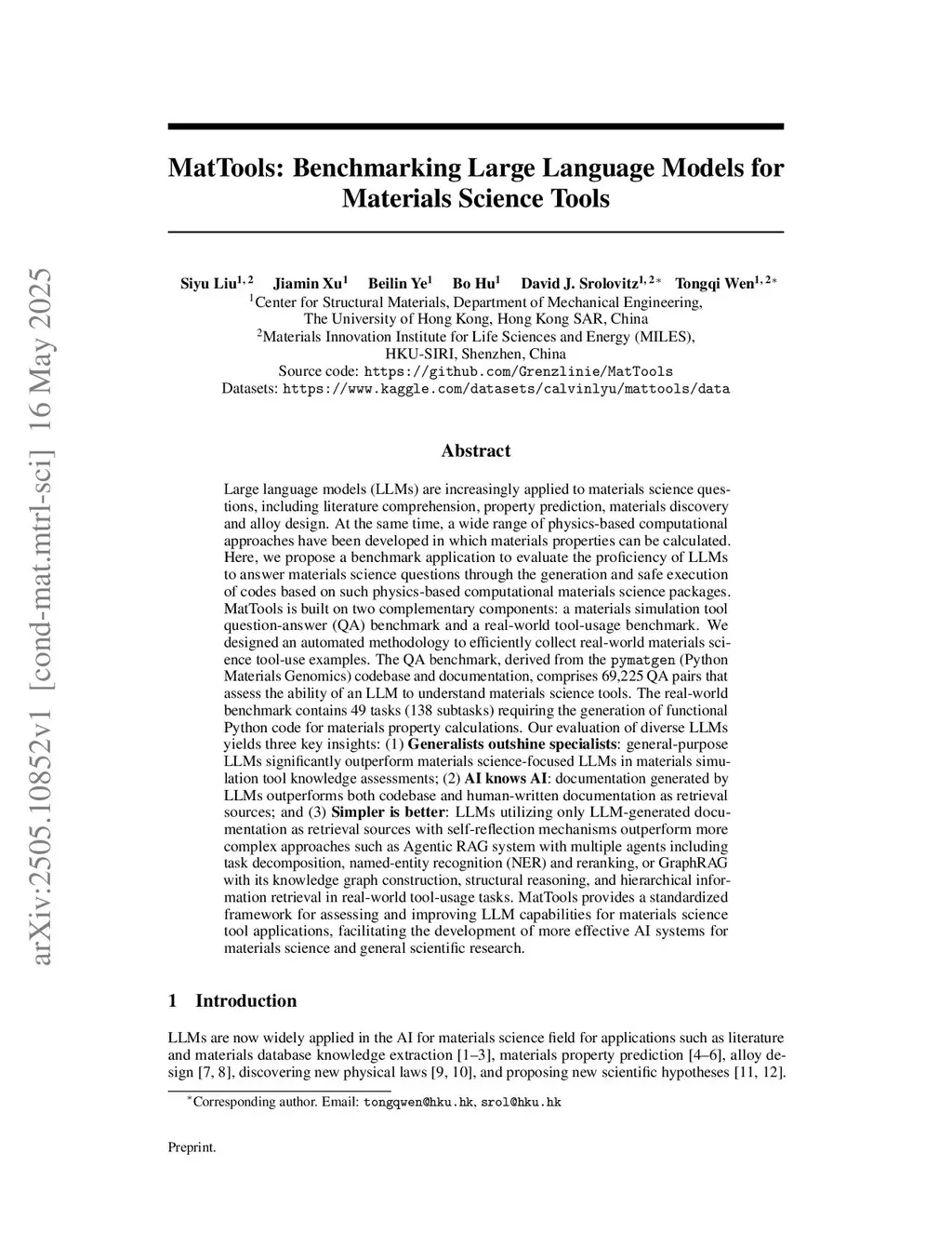 Large language models (LLMs) are increasingly applied to materials science questions, including literature comprehension, property prediction, materials discovery and alloy design. At the same time, a wide range of physics-based computational approaches have been developed in which materials properties can be calculated. Here, we propose a benchmark application to evaluate the proficiency of LLMs to answer materials science questions through the generation and safe execution of codes based on such physics-based computational materials science packages. MatTools is built on two complementary components: a materials simulation tool question-answer (QA) benchmark and a real-world tool-usage benchmark. We designed an automated methodology to efficiently collect real-world materials science tool-use examples. The QA benchmark, derived from the pymatgen (Python Materials Genomics) codebase and documentation, comprises 69,225 QA pairs that assess the ability of an LLM to understand materials science tools. The real-world benchmark contains 49 tasks (138 subtasks) requiring the generation of functional Python code for materials property calculations. Our evaluation of diverse LLMs yields three key insights: (1)Generalists outshine specialists;(2)AI knows AI; and (3)Simpler is better. MatTools provides a standardized framework for assessing and improving LLM capabilities for materials science tool applications, facilitating the development of more effective AI systems for materials science and general scientific research.