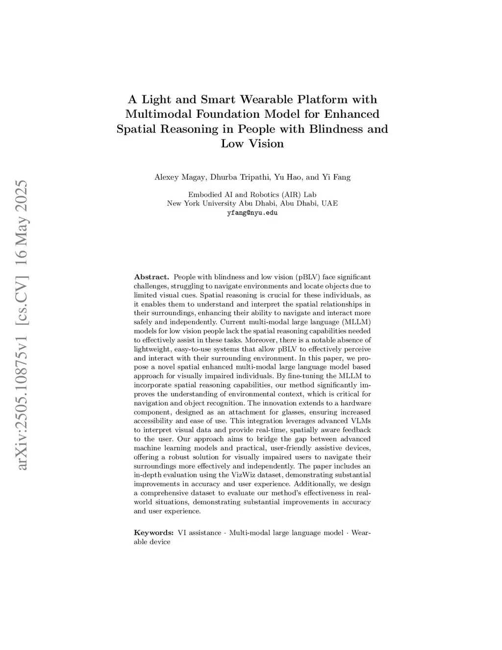 A Light and Smart Wearable Platform with Multimodal Foundation Model for Enhanced Spatial Reasoning in People with Blindness and Low Vision