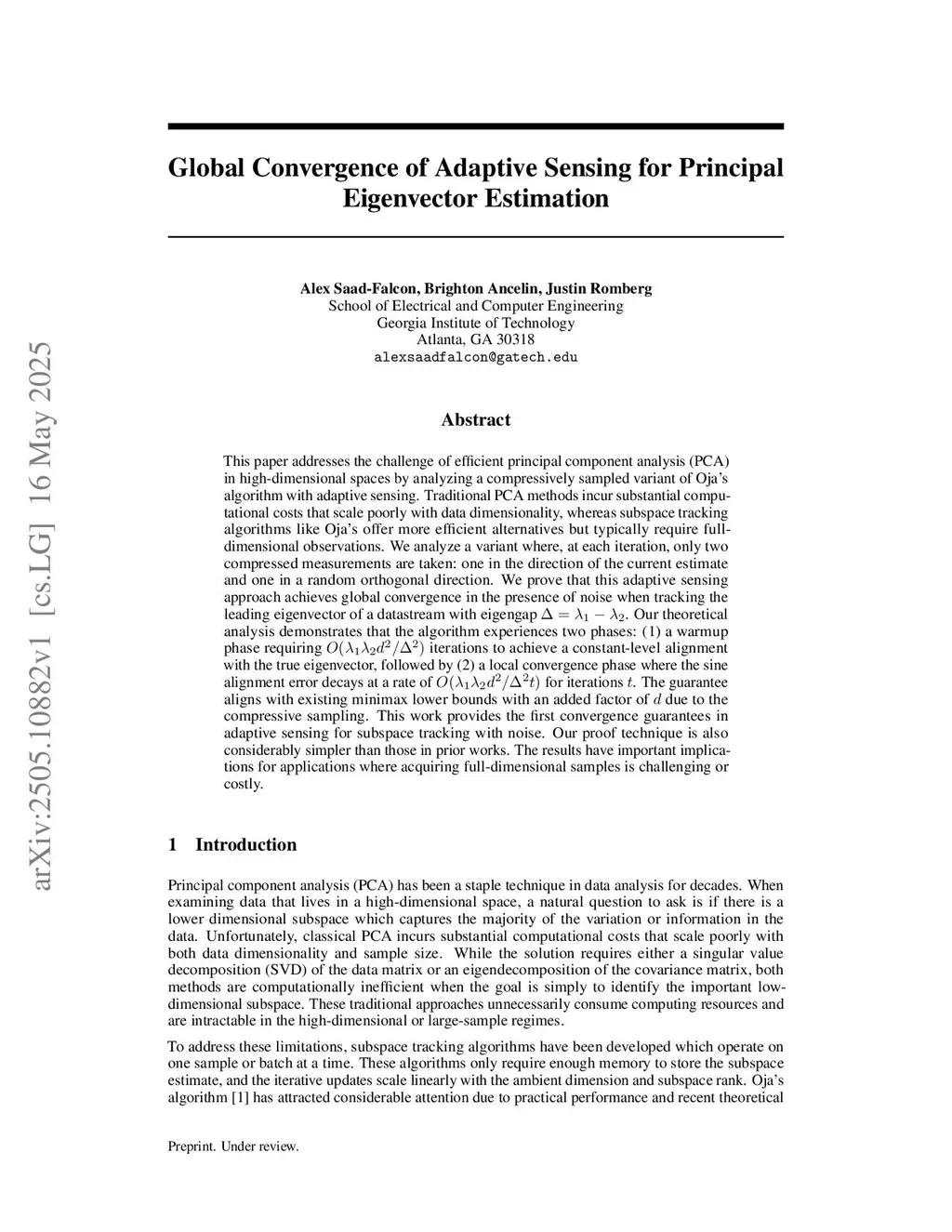 This paper addresses the challenge of efficient principal component analysis (PCA) in high-dimensional spaces by analyzing a compressively sampled variant of Oja's algorithm with adaptive sensing. Traditional PCA methods incur substantial computational costs that scale poorly with data dimensionality, whereas subspace tracking algorithms like Oja's offer more efficient alternatives but typically require full-dimensional observations. We analyze a variant where, at each iteration, only two compressed measurements are taken: one in the direction of the current estimate and one in a random orthogonal direction. We prove that this adaptive sensing approach achieves global convergence in the presence of noise when tracking the leading eigenvector of a datastream with eigengap . Our theoretical analysis demonstrates that the algorithm experiences two phases: (1) a warmup phase requiring iterations to achieve a constant-level alignment with the true eigenvector, followed by (2) a local convergence phase where the sine alignment error decays at a rate of for iterations . The guarantee aligns with existing minimax lower bounds with an added factor of due to the compressive sampling. This work provides the first convergence guarantees in adaptive sensing for subspace tracking with noise. Our proof technique is also considerably simpler than those in prior works. The results have important implications for applications where acquiring full-dimensional samples is challenging or costly.