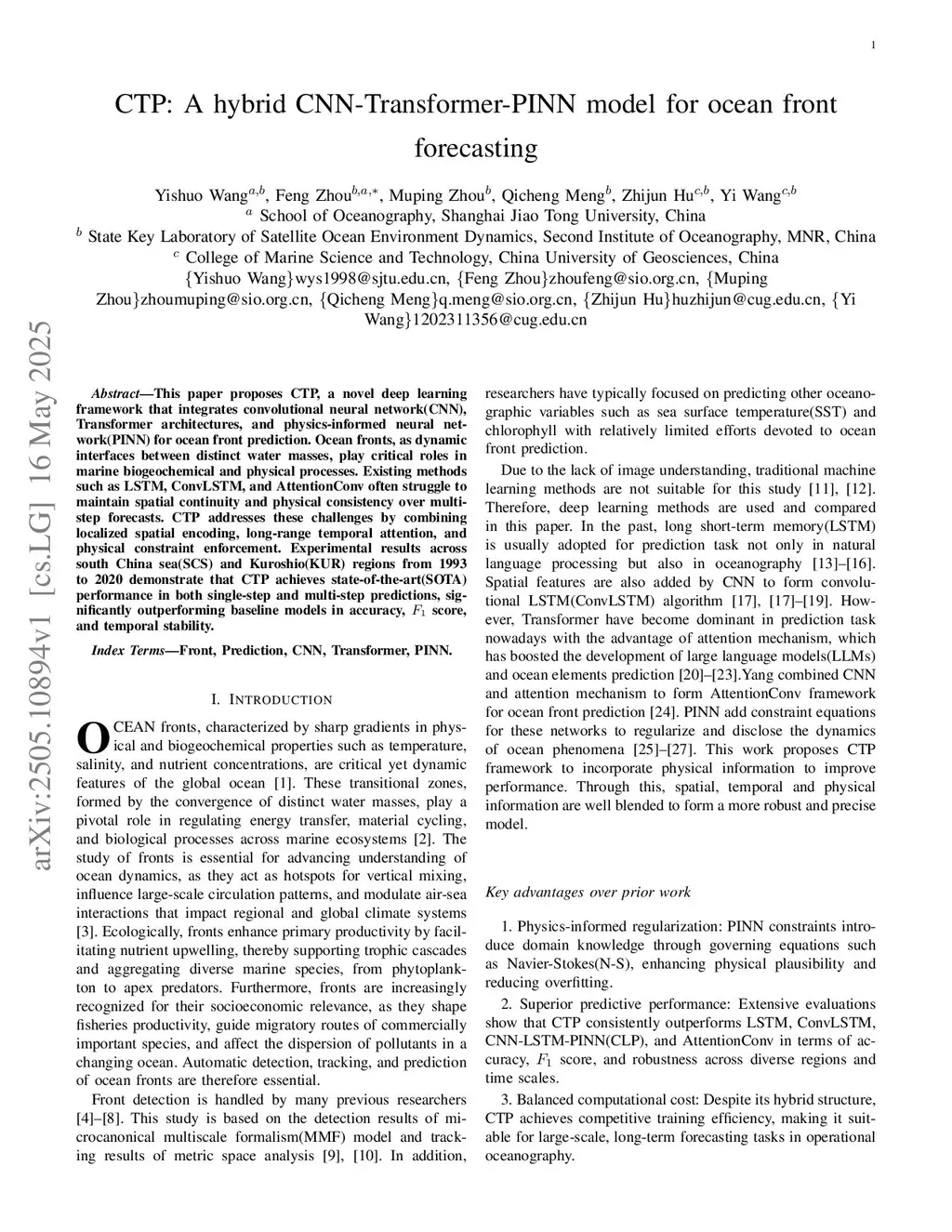 CTP: A hybrid CNN-Transformer-PINN model for ocean front forecasting