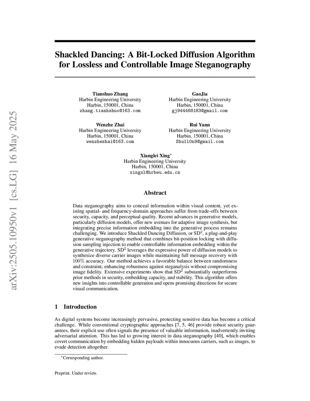 Data steganography aims to conceal information within visual content, yet existing spatial- and frequency-domain approaches suffer from trade-offs between security, capacity, and perceptual quality. Recent advances in generative models, particularly diffusion models, offer new avenues for adaptive image synthesis, but integrating precise information embedding into the generative process remains challenging. We introduce Shackled Dancing Diffusion, or SD, a plug-and-play generative steganography method that combines bit-position locking with diffusion sampling injection to enable controllable information embedding within the generative trajectory. SD leverages the expressive power of diffusion models to synthesize diverse carrier images while maintaining full message recovery with accuracy. Our method achieves a favorable balance between randomness and constraint, enhancing robustness against steganalysis without compromising image fidelity. Extensive experiments show that SD substantially outperforms prior methods in security, embedding capacity, and stability. This algorithm offers new insights into controllable generation and opens promising directions for secure visual communication.