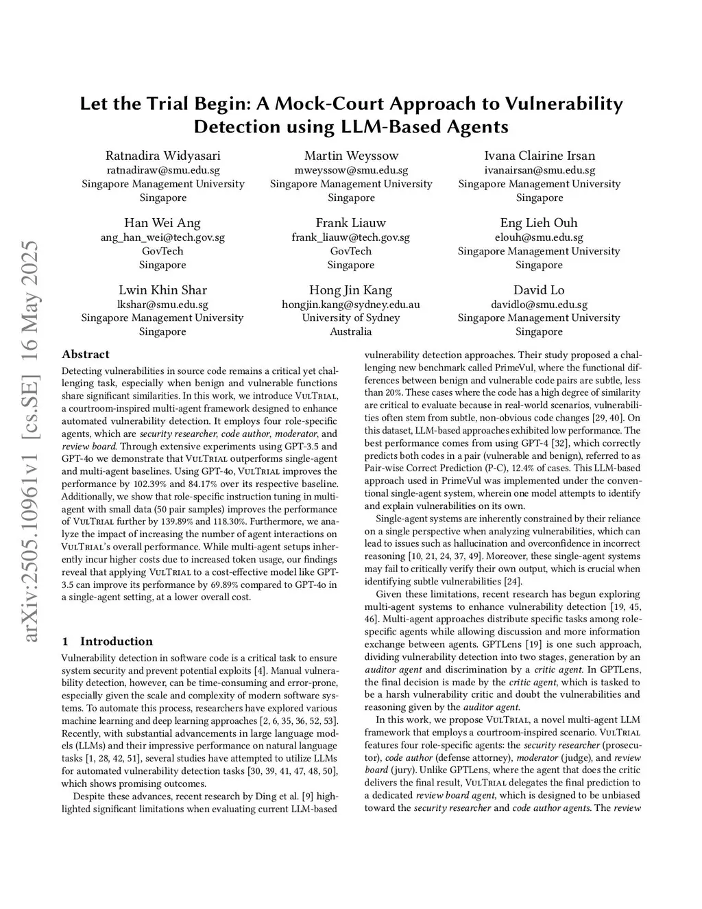 Detecting vulnerabilities in source code remains a critical yet challenging task, especially when benign and vulnerable functions share significant similarities. In this work, we introduce VulTrial, a courtroom-inspired multi-agent framework designed to identify vulnerable code and to provide explanations. It employs four role-specific agents, which are security researcher, code author, moderator, and review board. Using GPT-4o as the base LLM, VulTrial almost doubles the efficacy of prior best-performing baselines. Additionally, we show that role-specific instruction tuning with small quantities of data significantly further boosts VulTrial's efficacy. Our extensive experiments demonstrate the efficacy of VulTrial across different LLMs, including an open-source, in-house-deployable model (LLaMA-3.1-8B), as well as the high quality of its generated explanations and its ability to uncover multiple confirmed zero-day vulnerabilities in the wild.