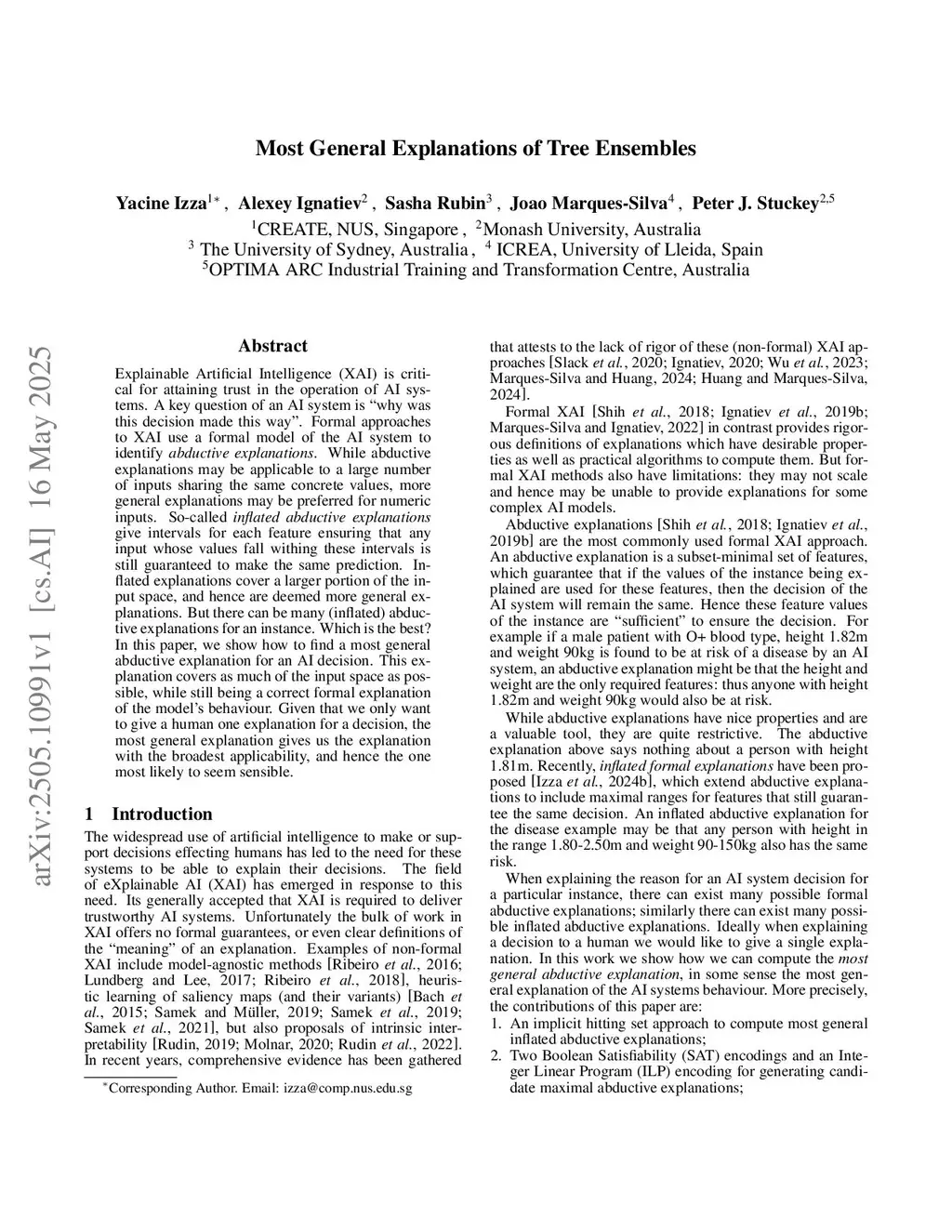Explainable Artificial Intelligence (XAI) is critical for attaining trust in the operation of AI systems. A key question of an AI system is ``why was this decision made this way''. Formal approaches to XAI use a formal model of the AI system to identify abductive explanations. While abductive explanations may be applicable to a large number of inputs sharing the same concrete values, more general explanations may be preferred for numeric inputs. So-called inflated abductive explanations give intervals for each feature ensuring that any input whose values fall withing these intervals is still guaranteed to make the same prediction. Inflated explanations cover a larger portion of the input space, and hence are deemed more general explanations. But there can be many (inflated) abductive explanations for an instance. Which is the best? In this paper, we show how to find a most general abductive explanation for an AI decision. This explanation covers as much of the input space as possible, while still being a correct formal explanation of the model's behaviour. Given that we only want to give a human one explanation for a decision, the most general explanation gives us the explanation with the broadest applicability, and hence the one most likely to seem sensible. (The paper has been accepted at IJCAI2025 conference.)