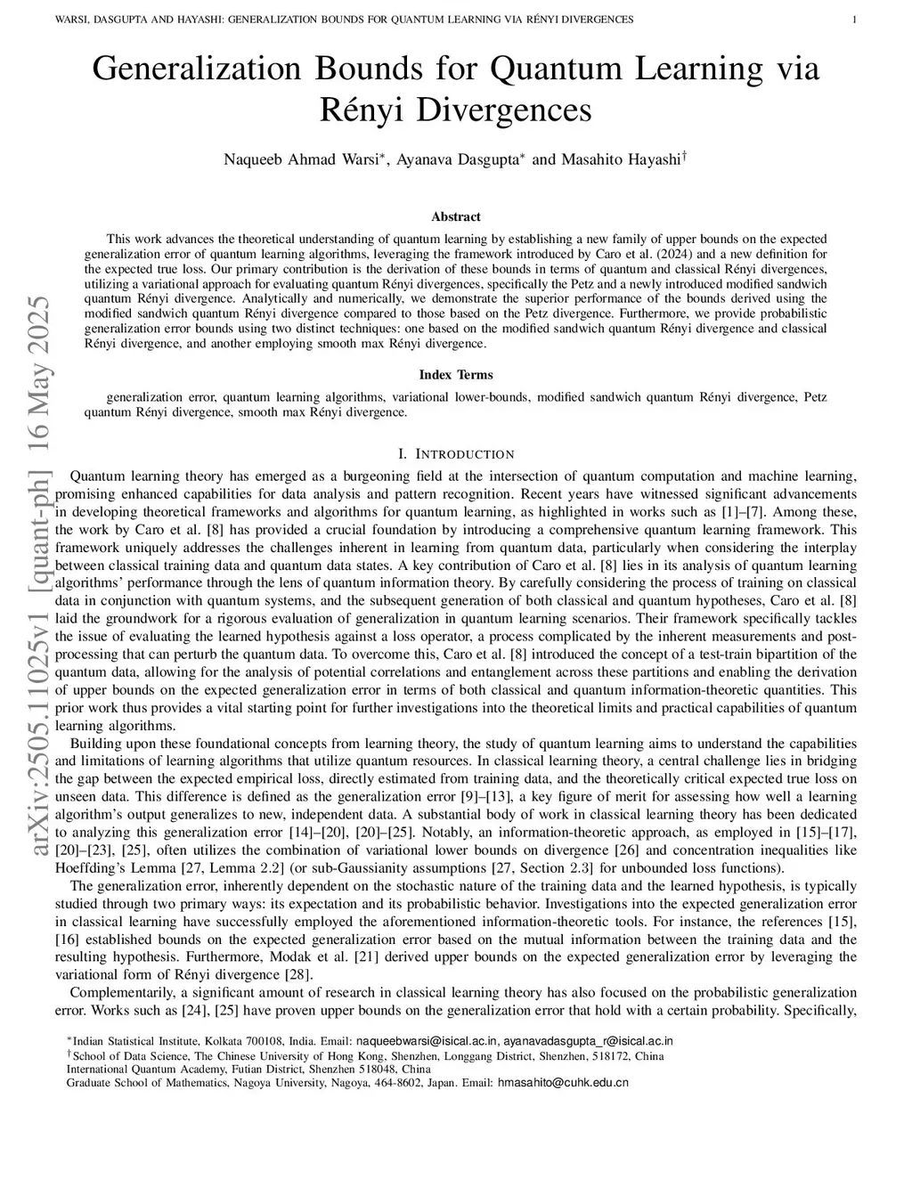 This work advances the theoretical understanding of quantum learning by establishing a new family of upper bounds on the expected generalization error of quantum learning algorithms, leveraging the framework introduced by Caro et al. (2024) and a new definition for the expected true loss. Our primary contribution is the derivation of these bounds in terms of quantum and classical Rényi divergences, utilizing a variational approach for evaluating quantum Rényi divergences, specifically the Petz and a newly introduced modified sandwich quantum Rényi divergence. Analytically and numerically, we demonstrate the superior performance of the bounds derived using the modified sandwich quantum Rényi divergence compared to those based on the Petz divergence. Furthermore, we provide probabilistic generalization error bounds using two distinct techniques: one based on the modified sandwich quantum Rényi divergence and classical Rényi divergence, and another employing smooth max Rényi divergence.