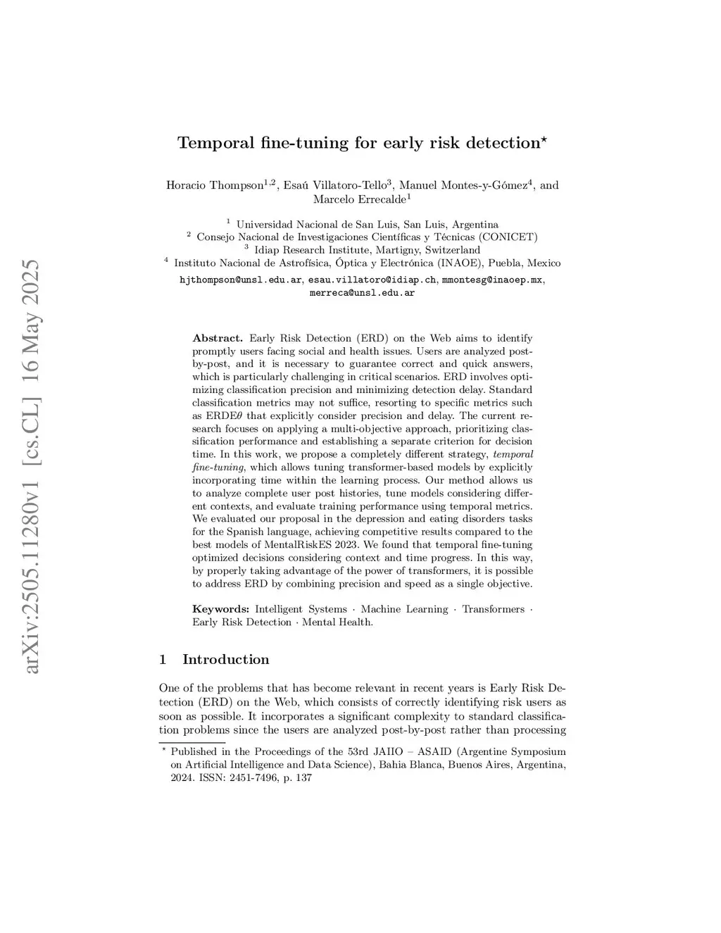 Early Risk Detection (ERD) on the Web aims to identify promptly users facing social and health issues. Users are analyzed post-by-post, and it is necessary to guarantee correct and quick answers, which is particularly challenging in critical scenarios. ERD involves optimizing classification precision and minimizing detection delay. Standard classification metrics may not suffice, resorting to specific metrics such as ERDE(theta) that explicitly consider precision and delay. The current research focuses on applying a multi-objective approach, prioritizing classification performance and establishing a separate criterion for decision time. In this work, we propose a completely different strategy, temporal fine-tuning, which allows tuning transformer-based models by explicitly incorporating time within the learning process. Our method allows us to analyze complete user post histories, tune models considering different contexts, and evaluate training performance using temporal metrics. We evaluated our proposal in the depression and eating disorders tasks for the Spanish language, achieving competitive results compared to the best models of MentalRiskES 2023. We found that temporal fine-tuning optimized decisions considering context and time progress. In this way, by properly taking advantage of the power of transformers, it is possible to address ERD by combining precision and speed as a single objective.