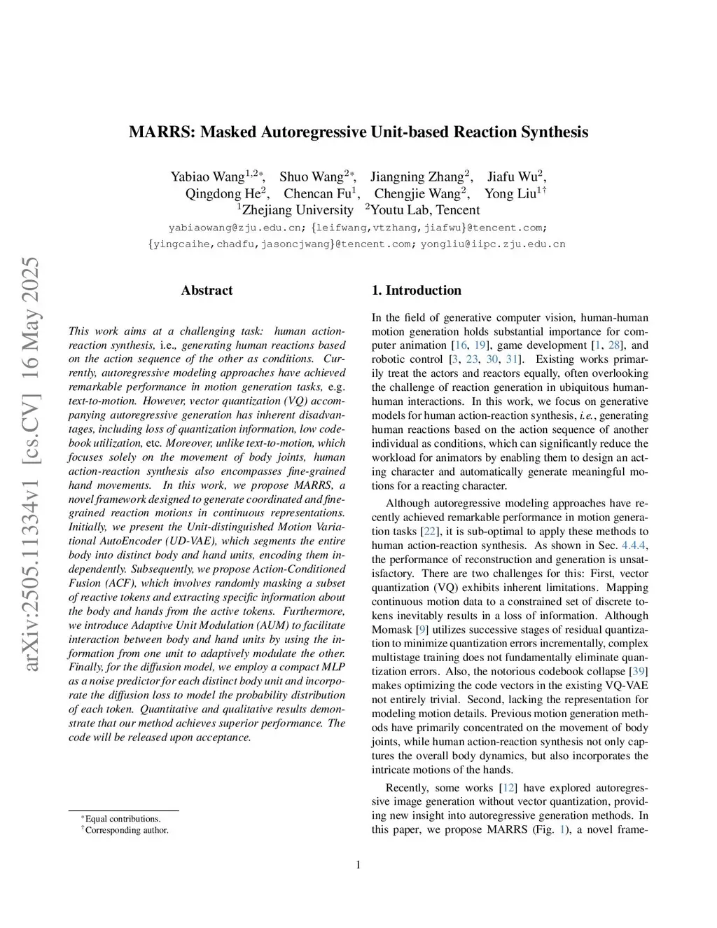 This work aims at a challenging task: human action-reaction synthesis, i.e., generating human reactions conditioned on the action sequence of another person. Currently, autoregressive modeling approaches with vector quantization (VQ) have achieved remarkable performance in motion generation tasks. However, VQ has inherent disadvantages, including quantization information loss, low codebook utilization, etc. In addition, while dividing the body into separate units can be beneficial, the computational complexity needs to be considered. Also, the importance of mutual perception among units is often neglected. In this work, we propose MARRS, a novel framework designed to generate coordinated and fine-grained reaction motions using continuous representations. Initially, we present the Unit-distinguished Motion Variational AutoEncoder (UD-VAE), which segments the entire body into distinct body and hand units, encoding each independently. Subsequently, we propose Action-Conditioned Fusion (ACF), which involves randomly masking a subset of reactive tokens and extracting specific information about the body and hands from the active tokens. Furthermore, we introduce Adaptive Unit Modulation (AUM) to facilitate interaction between body and hand units by using the information from one unit to adaptively modulate the other. Finally, for the diffusion model, we employ a compact MLP as a noise predictor for each distinct body unit and incorporate the diffusion loss to model the probability distribution of each token. Both quantitative and qualitative results demonstrate that our method achieves superior performance. The code will be released upon acceptance.