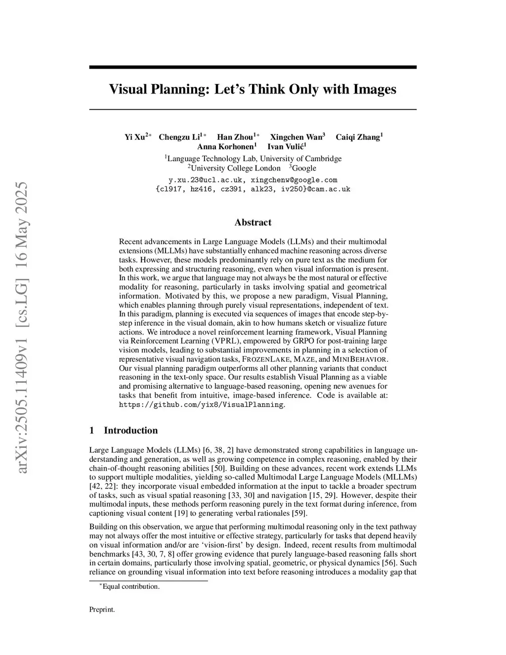 Recent advancements in Large Language Models (LLMs) and their multimodal extensions (MLLMs) have substantially enhanced machine reasoning across diverse tasks. However, these models predominantly rely on pure text as the medium for both expressing and structuring reasoning, even when visual information is present. In this work, we argue that language may not always be the most natural or effective modality for reasoning, particularly in tasks involving spatial and geometrical information. Motivated by this, we propose a new paradigm, Visual Planning, which enables planning through purely visual representations for these "vision-first" tasks, as a supplementary channel to language-based reasoning. In this paradigm, planning is executed via sequences of images that encode step-by-step inference in the visual domain, akin to how humans sketch or visualize future actions. We introduce a novel reinforcement learning framework, Visual Planning via Reinforcement Learning (VPRL), empowered by GRPO for post-training large vision models, leading to substantial improvements in planning in a selection of representative visual navigation tasks, FrozenLake, Maze, and MiniBehavior. Our visual planning paradigm outperforms all other planning variants that conduct reasoning in the text-only space. Our results establish Visual Planning as a viable and promising supplement to language-based reasoning, opening new avenues for tasks that benefit from intuitive, image-based inference.