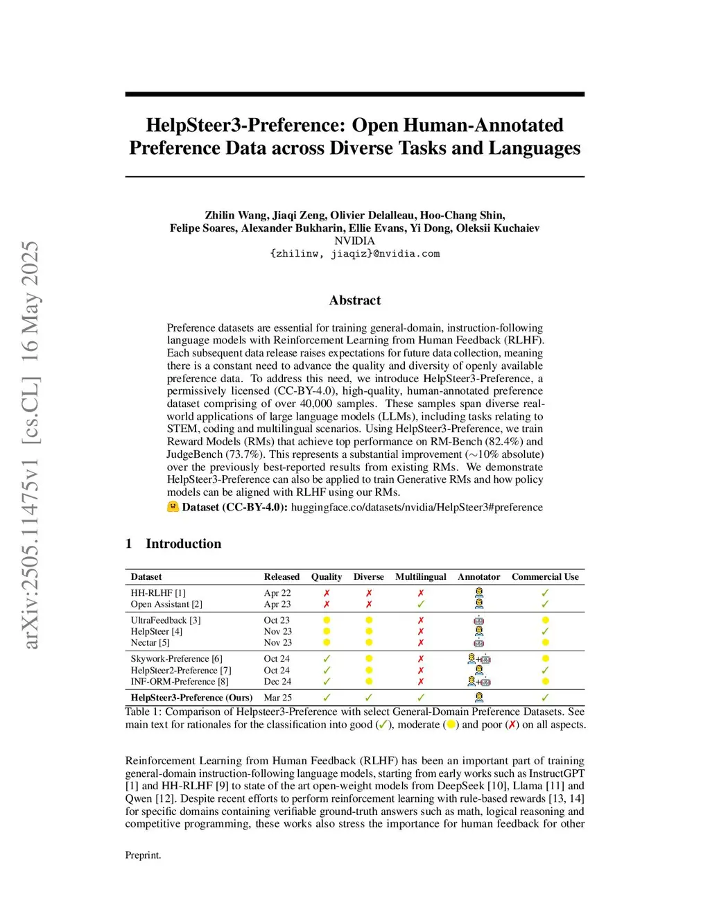 Preference datasets are essential for training general-domain, instruction-following language models with Reinforcement Learning from Human Feedback (RLHF). Each subsequent data release raises expectations for future data collection, meaning there is a constant need to advance the quality and diversity of openly available preference data. To address this need, we introduce HelpSteer3-Preference, a permissively licensed (CC-BY-4.0), high-quality, human-annotated preference dataset comprising of over 40,000 samples. These samples span diverse real-world applications of large language models (LLMs), including tasks relating to STEM, coding and multilingual scenarios. Using HelpSteer3-Preference, we train Reward Models (RMs) that achieve top performance on RM-Bench (82.4%) and JudgeBench (73.7%). This represents a substantial improvement (~10% absolute) over the previously best-reported results from existing RMs. We demonstrate HelpSteer3-Preference can also be applied to train Generative RMs and how policy models can be aligned with RLHF using our RMs. Dataset (CC-BY-4.0):this https URLModels (NVIDIA Open Model):this https URL
