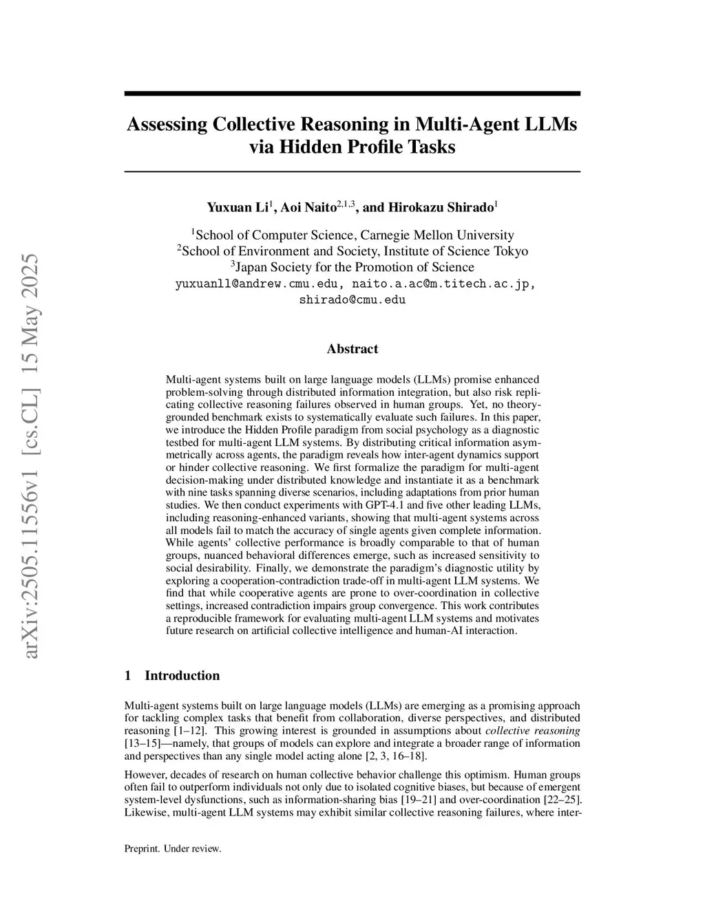 Multi-agent systems built on large language models (LLMs) are expected to enhance decision-making by pooling distributed information, yet systematically evaluating this capability has remained challenging. We introduce HiddenBench, a 65-task benchmark grounded in the Hidden Profile paradigm, which isolates collective reasoning under distributed information from individual reasoning ability. Evaluating 15 frontier LLMs, we find that multi-agent LLMs achieve only 30.1% accuracy under distributed information, compared to 80.7% accuracy for single agents given complete information. We trace this gap to a systematic failure mode: agents cannot recognize or act under latent information asymmetry-they fail to reason about what others might know but have not yet expressed, leading to premature convergence on shared evidence while critical distributed facts remain unexplored. These failures persist across prompting strategies, communication depths, and group sizes-and worsen as groups scale. While some models (e.g., Gemini-2.5-Flash/Pro) outperform others, neither model scale nor individual reasoning accuracy reliably predicts collective performance. Our results identify failures in collective information exploration in decision-making as a key limitation of multi-agent LLMs, and provide a theory-grounded, reproducible framework for diagnosing collective reasoning failures.