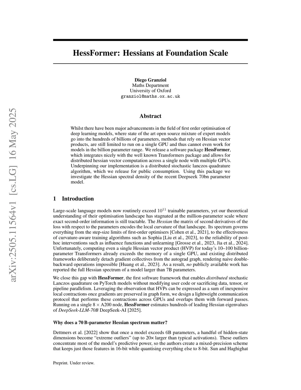 Whilst there have been major advancements in the field of first order optimisation of deep learning models, where state of the art open source mixture of expert models go into the hundreds of billions of parameters, methods that rely on Hessian vector products, are still limited to run on a single GPU and thus cannot even work for models in the billion parameter range. We release a software package \textbf{HessFormer}, which integrates nicely with the well known Transformers package and allows for distributed hessian vector computation across a single node with multiple GPUs. Underpinning our implementation is a distributed stochastic lanczos quadrature algorithm, which we release for public consumption. Using this package we investigate the Hessian spectral density of the recent Deepseek bn parameter model.
