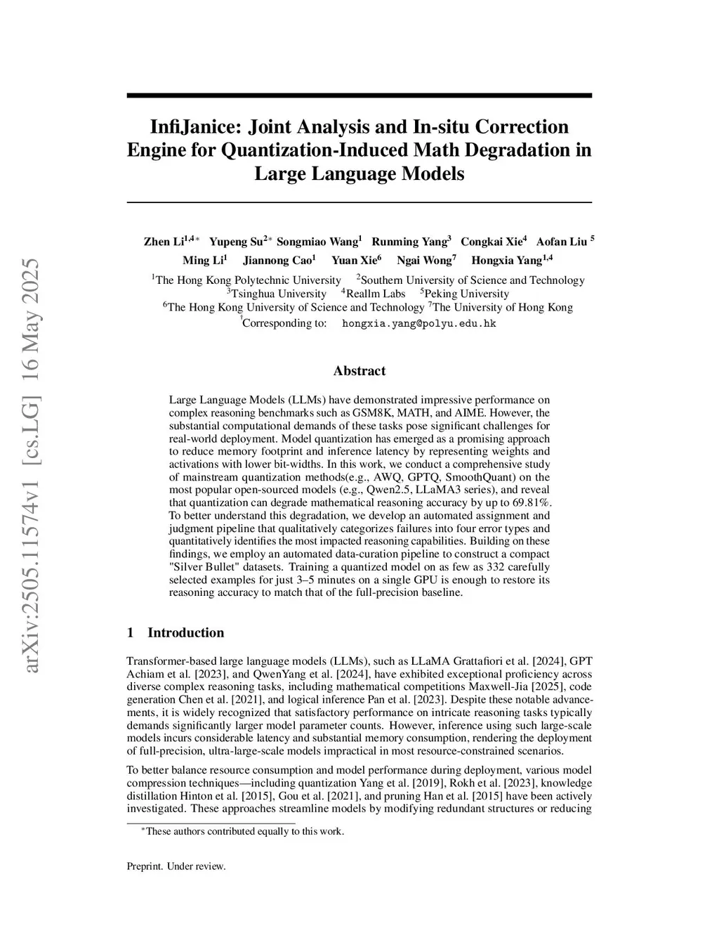 Low-bit post-training quantization (PTQ) is a practical route to deploy reasoning-capable LLMs under tight memory and latency budgets, yet it can markedly impair mathematical reasoning (drops up to 69.81% in our harder settings). We address two deployment-critical questions with process-level precision: Where along a step-structured solution does degradation first arise? How to mitigate it while staying in the low-bit regime? Across widely used PTQ methods (AWQ, GPTQ, SmoothQuant), open-source model families (Qwen, LLaMA; 0.5--7B), and math reasoning benchmarks (GSM8K, MATH, AIME), we perform format-aligned chain-of-thought with step-aligned attribution and uncover two robust regularities: (i) PTQ disproportionately elevates method and execution errors relative to high-level conceptual mistakes; and (ii) failures emerge early, with the first vulnerable step flipping and cascading to the final answer. These regularities suggest a general intervention principle: restore local token-level margins exactly at the earliest failure frontier. We instantiate this principle as a lightweight measurelocaterestore loop that operates directly on the quantized model: detect the first faulty step, construct our "Silver Bullet" datasets, and apply small-scale supervised/preference tuning. In our settings, as few as 332 curated examples and 3--5 minutes of compute on a single GPU recover 4-bit weight math reasoning toward the full-precision baseline while preserving PTQ efficiency. Our framework is quantizer- and architecture-agnostic within the evaluated regimes, and turns low-bit degradation from a global accuracy problem into a local, reproducible process intervention.