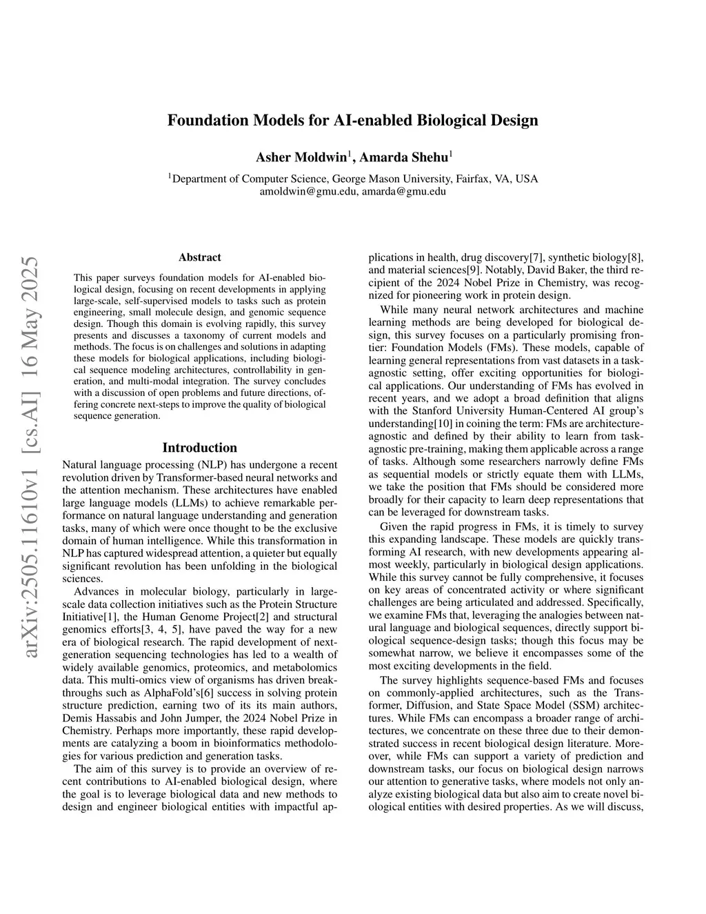 This paper surveys foundation models for AI-enabled biological design, focusing on recent developments in applying large-scale, self-supervised models to tasks such as protein engineering, small molecule design, and genomic sequence design. Though this domain is evolving rapidly, this survey presents and discusses a taxonomy of current models and methods. The focus is on challenges and solutions in adapting these models for biological applications, including biological sequence modeling architectures, controllability in generation, and multi-modal integration. The survey concludes with a discussion of open problems and future directions, offering concrete next-steps to improve the quality of biological sequence generation.