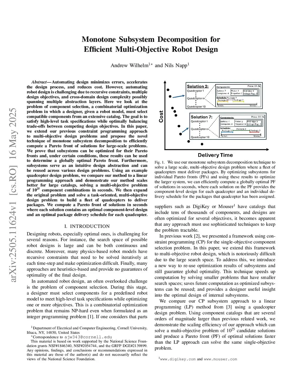 Automating design minimizes errors, accelerates the design process, and reduces cost. However, automating robot design is challenging due to recursive constraints, multiple design objectives, and cross-domain design complexity possibly spanning multiple abstraction layers. Here we look at the problem of component selection, a combinatorial optimization problem in which a designer, given a robot model, must select compatible components from an extensive catalog. The goal is to satisfy high-level task specifications while optimally balancing trade-offs between competing design objectives. In this paper, we extend our previous constraint programming approach to multi-objective design problems and propose the novel technique of monotone subsystem decomposition to efficiently compute a Pareto front of solutions for large-scale problems. We prove that subsystems can be optimized for their Pareto fronts and, under certain conditions, these results can be used to determine a globally optimal Pareto front. Furthermore, subsystems serve as an intuitive design abstraction and can be reused across various design problems. Using an example quadcopter design problem, we compare our method to a linear programming approach and demonstrate our method scales better for large catalogs, solving a multi-objective problem of 10^25 component combinations in seconds. We then expand the original problem and solve a task-oriented, multi-objective design problem to build a fleet of quadcopters to deliver packages. We compute a Pareto front of solutions in seconds where each solution contains an optimal component-level design and an optimal package delivery schedule for each quadcopter.