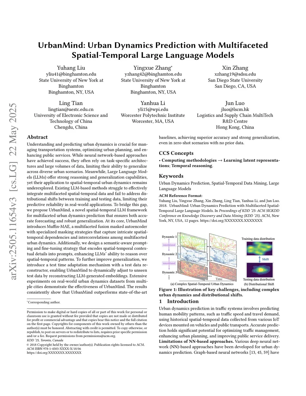 Understanding and predicting urban dynamics is crucial for managing transportation systems, optimizing urban planning, and enhancing public services. While neural network-based approaches have achieved success, they often rely on task-specific architectures and large volumes of data, limiting their ability to generalize across diverse urban scenarios. Meanwhile, Large Language Models (LLMs) offer strong reasoning and generalization capabilities, yet their application to spatial-temporal urban dynamics remains underexplored. Existing LLM-based methods struggle to effectively integrate multifaceted spatial-temporal data and fail to address distributional shifts between training and testing data, limiting their predictive reliability in real-world applications. To bridge this gap, we propose UrbanMind, a novel spatial-temporal LLM framework for multifaceted urban dynamics prediction that ensures both accurate forecasting and robust generalization. At its core, UrbanMind introduces Muffin-MAE, a multifaceted fusion masked autoencoder with specialized masking strategies that capture intricate spatial-temporal dependencies and intercorrelations among multifaceted urban dynamics. Additionally, we design a semantic-aware prompting and fine-tuning strategy that encodes spatial-temporal contextual details into prompts, enhancing LLMs' ability to reason over spatial-temporal patterns. To further improve generalization, we introduce a test time adaptation mechanism with a test data reconstructor, enabling UrbanMind to dynamically adjust to unseen test data by reconstructing LLM-generated embeddings. Extensive experiments on real-world urban datasets across multiple cities demonstrate that UrbanMind consistently outperforms state-of-the-art baselines, achieving high accuracy and robust generalization, even in zero-shot settings.