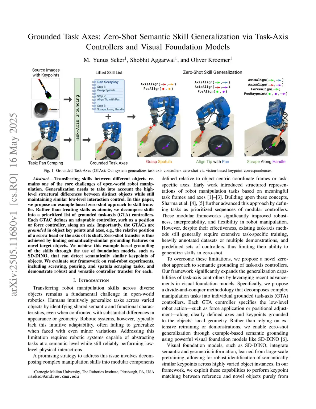 Transferring skills between different objects remains one of the core challenges of open-world robot manipulation. Generalization needs to take into account the high-level structural differences between distinct objects while still maintaining similar low-level interaction control. In this paper, we propose an example-based zero-shot approach to skill transfer. Rather than treating skills as atomic, we decompose skills into a prioritized list of grounded task-axis (GTA) controllers. Each GTAC defines an adaptable controller, such as a position or force controller, along an axis. Importantly, the GTACs are grounded in object key points and axes, e.g., the relative position of a screw head or the axis of its shaft. Zero-shot transfer is thus achieved by finding semantically-similar grounding features on novel target objects. We achieve this example-based grounding of the skills through the use of foundation models, such as SD-DINO, that can detect semantically similar keypoints of objects. We evaluate our framework on real-robot experiments, including screwing, pouring, and spatula scraping tasks, and demonstrate robust and versatile controller transfer for each.