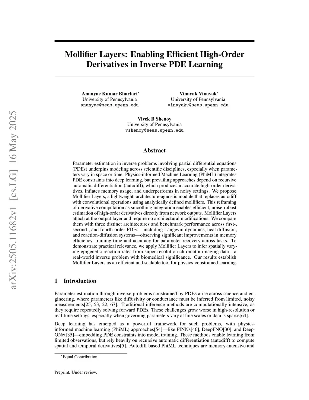 Parameter estimation in inverse problems involving partial differential equations (PDEs) underpins modeling across scientific disciplines, especially when parameters vary in space or time. Physics-informed Machine Learning (PhiML) integrates PDE constraints into deep learning, but prevailing approaches depend on recursive automatic differentiation (autodiff), which produces inaccurate high-order derivatives, inflates memory usage, and underperforms in noisy settings. We propose Mollifier Layers, a lightweight, architecture-agnostic module that replaces autodiff with convolutional operations using analytically defined mollifiers. This reframing of derivative computation as smoothing integration enables efficient, noise-robust estimation of high-order derivatives directly from network outputs. Mollifier Layers attach at the output layer and require no architectural modifications. We compare them with three distinct architectures and benchmark performance across first-, second-, and fourth-order PDEs -- including Langevin dynamics, heat diffusion, and reaction-diffusion systems -- observing significant improvements in memory efficiency, training time and accuracy for parameter recovery across tasks. To demonstrate practical relevance, we apply Mollifier Layers to infer spatially varying epigenetic reaction rates from super-resolution chromatin imaging data -- a real-world inverse problem with biomedical significance. Our results establish Mollifier Layers as an efficient and scalable tool for physics-constrained learning.