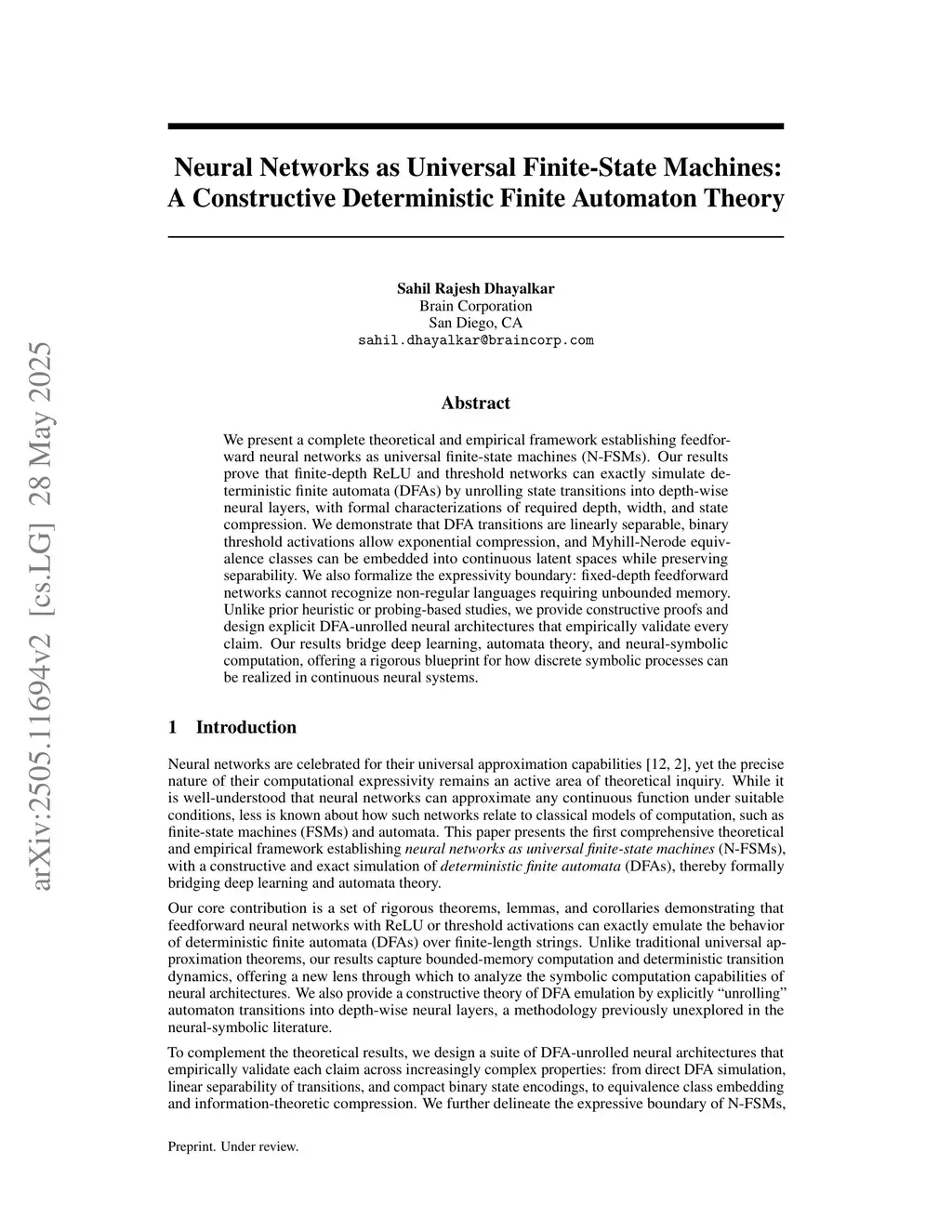 We present a complete theoretical and empirical framework establishing feedforward neural networks as universal finite-state machines (N-FSMs). Our results prove that finite-depth ReLU and threshold networks can exactly simulate deterministic finite automata (DFAs) by unrolling state transitions into depth-wise neural layers, with formal characterizations of required depth, width, and state compression. We demonstrate that DFA transitions are linearly separable, binary threshold activations allow exponential compression, and Myhill-Nerode equivalence classes can be embedded into continuous latent spaces while preserving separability. We also formalize the expressivity boundary: fixed-depth feedforward networks cannot recognize non-regular languages requiring unbounded memory. Unlike prior heuristic or probing-based studies, we provide constructive proofs and design explicit DFA-unrolled neural architectures that empirically validate every claim. Our results bridge deep learning, automata theory, and neural-symbolic computation, offering a rigorous blueprint for how discrete symbolic processes can be realized in continuous neural systems.