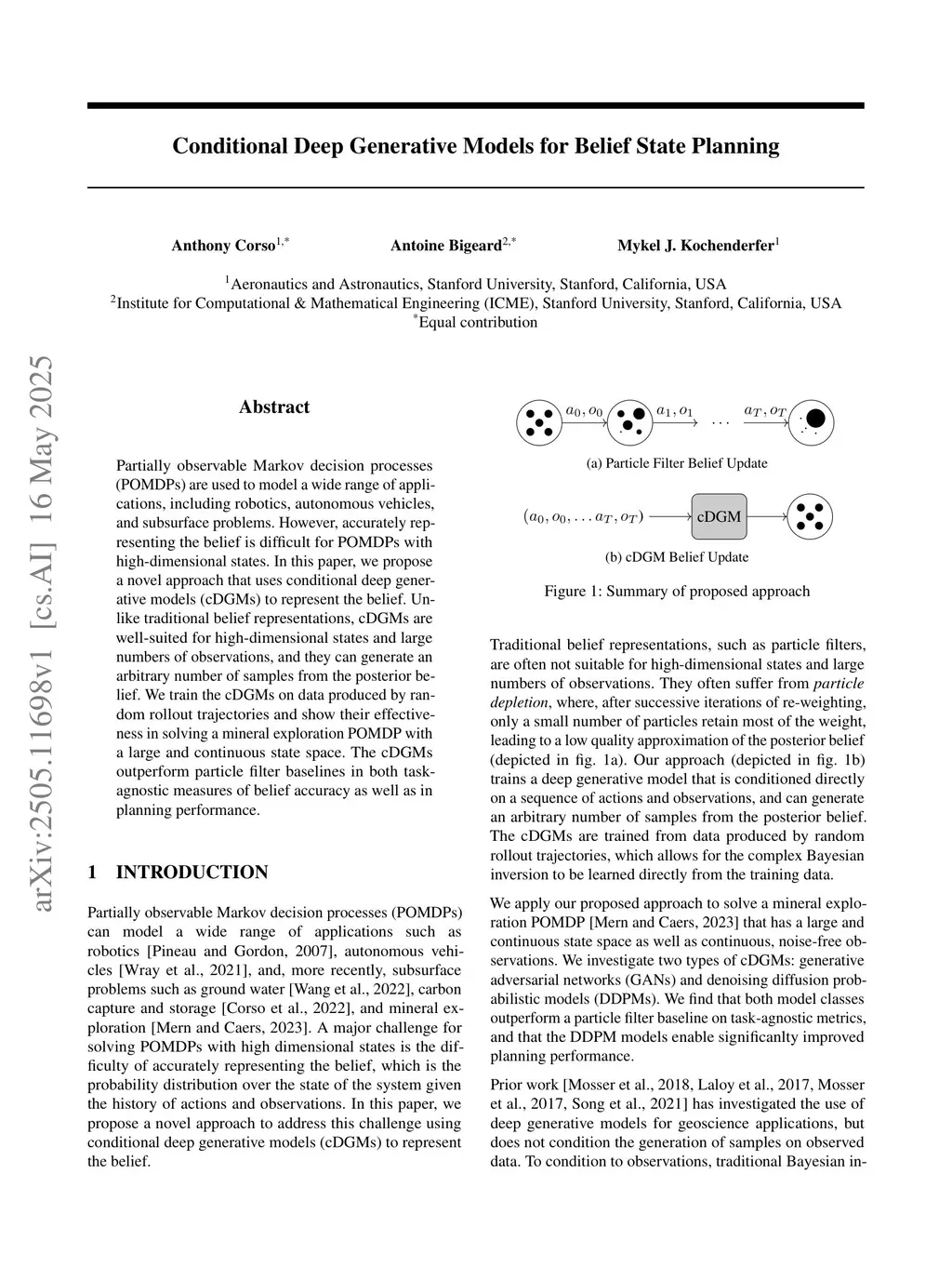 Partially observable Markov decision processes (POMDPs) are used to model a wide range of applications, including robotics, autonomous vehicles, and subsurface problems. However, accurately representing the belief is difficult for POMDPs with high-dimensional states. In this paper, we propose a novel approach that uses conditional deep generative models (cDGMs) to represent the belief. Unlike traditional belief representations, cDGMs are well-suited for high-dimensional states and large numbers of observations, and they can generate an arbitrary number of samples from the posterior belief. We train the cDGMs on data produced by random rollout trajectories and show their effectiveness in solving a mineral exploration POMDP with a large and continuous state space. The cDGMs outperform particle filter baselines in both task-agnostic measures of belief accuracy as well as in planning performance.