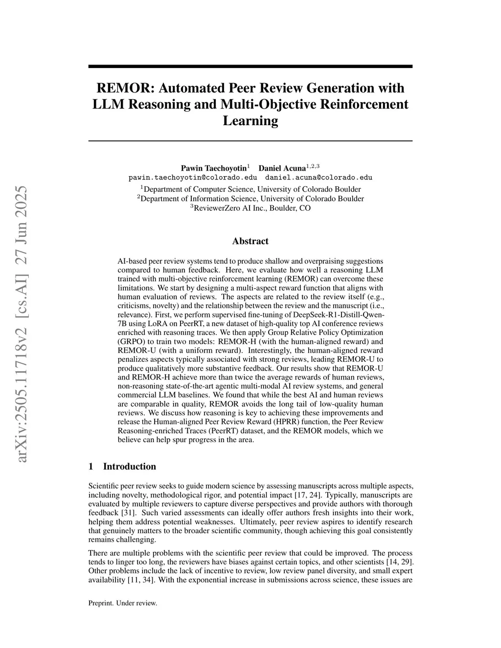 REMOR: Automated Peer Review Generation with LLM Reasoning and Multi-Objective Reinforcement Learning