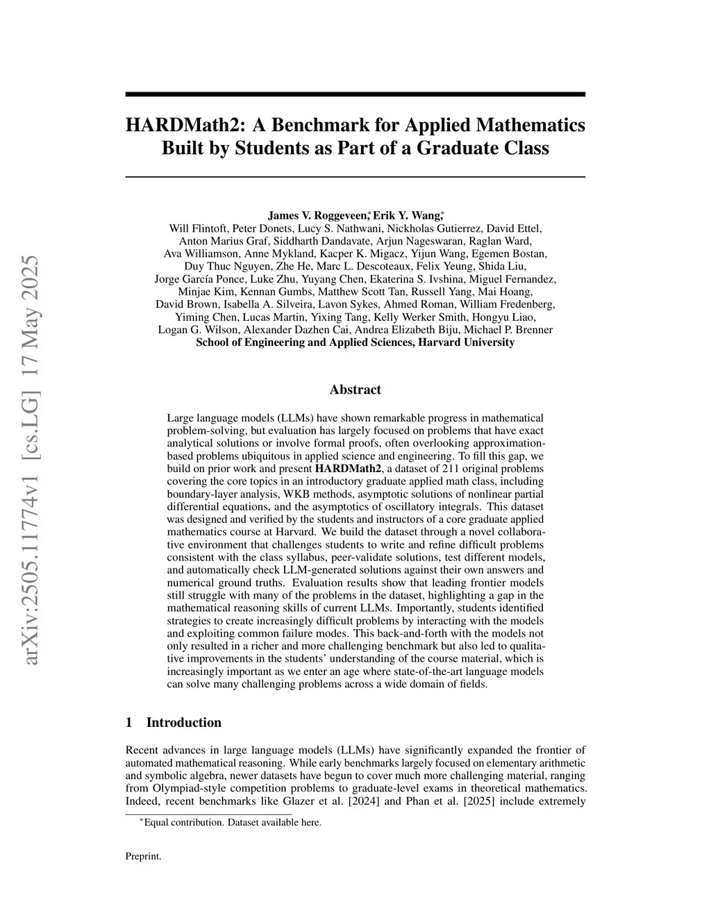 Large language models (LLMs) have shown remarkable progress in mathematical problem-solving, but evaluation has largely focused on problems that have exact analytical solutions or involve formal proofs, often overlooking approximation-based problems ubiquitous in applied science and engineering. To fill this gap, we build on prior work and present HARDMath2, a dataset of 211 original problems covering the core topics in an introductory graduate applied math class, including boundary-layer analysis, WKB methods, asymptotic solutions of nonlinear partial differential equations, and the asymptotics of oscillatory integrals. This dataset was designed and verified by the students and instructors of a core graduate applied mathematics course at Harvard. We build the dataset through a novel collaborative environment that challenges students to write and refine difficult problems consistent with the class syllabus, peer-validate solutions, test different models, and automatically check LLM-generated solutions against their own answers and numerical ground truths. Evaluation results show that leading frontier models still struggle with many of the problems in the dataset, highlighting a gap in the mathematical reasoning skills of current LLMs. Importantly, students identified strategies to create increasingly difficult problems by interacting with the models and exploiting common failure modes. This back-and-forth with the models not only resulted in a richer and more challenging benchmark but also led to qualitative improvements in the students' understanding of the course material, which is increasingly important as we enter an age where state-of-the-art language models can solve many challenging problems across a wide domain of fields.