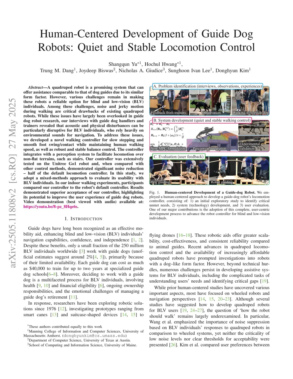Human-Centered Development of Guide Dog Robots: Quiet and Stable Locomotion Control
