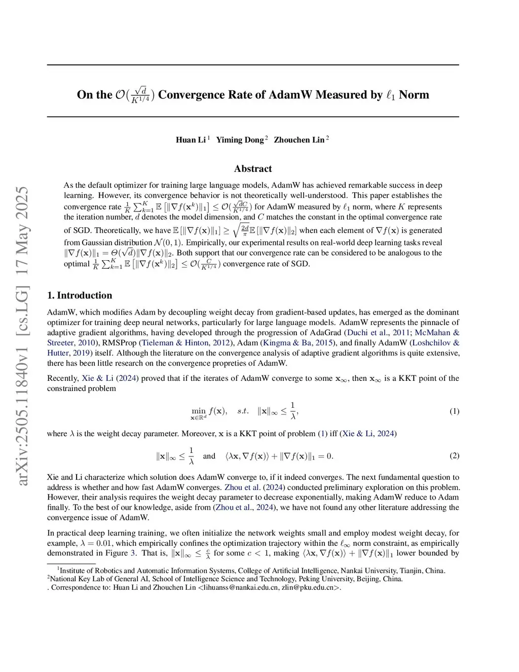 As the default optimizer for training large language models, AdamW has achieved remarkable success in deep learning. However, its convergence behavior is not theoretically well-understood. This paper establishes the convergence rate for AdamW measured by norm, where represents the iteration number, denotes the model dimension, and matches the constant in the optimal convergence rate of SGD. Theoretically, we have for any high-dimensional vector and when each element of is generated from Gaussian distribution . Empirically, our experimental results on real-world deep learning tasks reveal . Both support that our convergence rate can be considered to be analogous to the optimal convergence rate of SGD in the ideal case. We also extend our result to NAdamW, an AdamW variant that employs a double-momentum mechanism, and demonstrate that it maintains the same convergence rate.