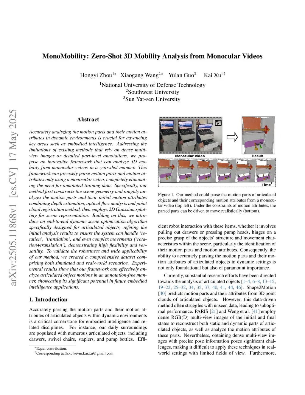 Accurately analyzing the motion parts and their motion attributes in dynamic environments is crucial for advancing key areas such as embodied intelligence. Addressing the limitations of existing methods that rely on dense multi-view images or detailed part-level annotations, we propose an innovative framework that can analyze 3D mobility from monocular videos in a zero-shot manner. This framework can precisely parse motion parts and motion attributes only using a monocular video, completely eliminating the need for annotated training data. Specifically, our method first constructs the scene geometry and roughly analyzes the motion parts and their initial motion attributes combining depth estimation, optical flow analysis and point cloud registration method, then employs 2D Gaussian splatting for scene representation. Building on this, we introduce an end-to-end dynamic scene optimization algorithm specifically designed for articulated objects, refining the initial analysis results to ensure the system can handle 'rotation', 'translation', and even complex movements ('rotation+translation'), demonstrating high flexibility and versatility. To validate the robustness and wide applicability of our method, we created a comprehensive dataset comprising both simulated and real-world scenarios. Experimental results show that our framework can effectively analyze articulated object motions in an annotation-free manner, showcasing its significant potential in future embodied intelligence applications.