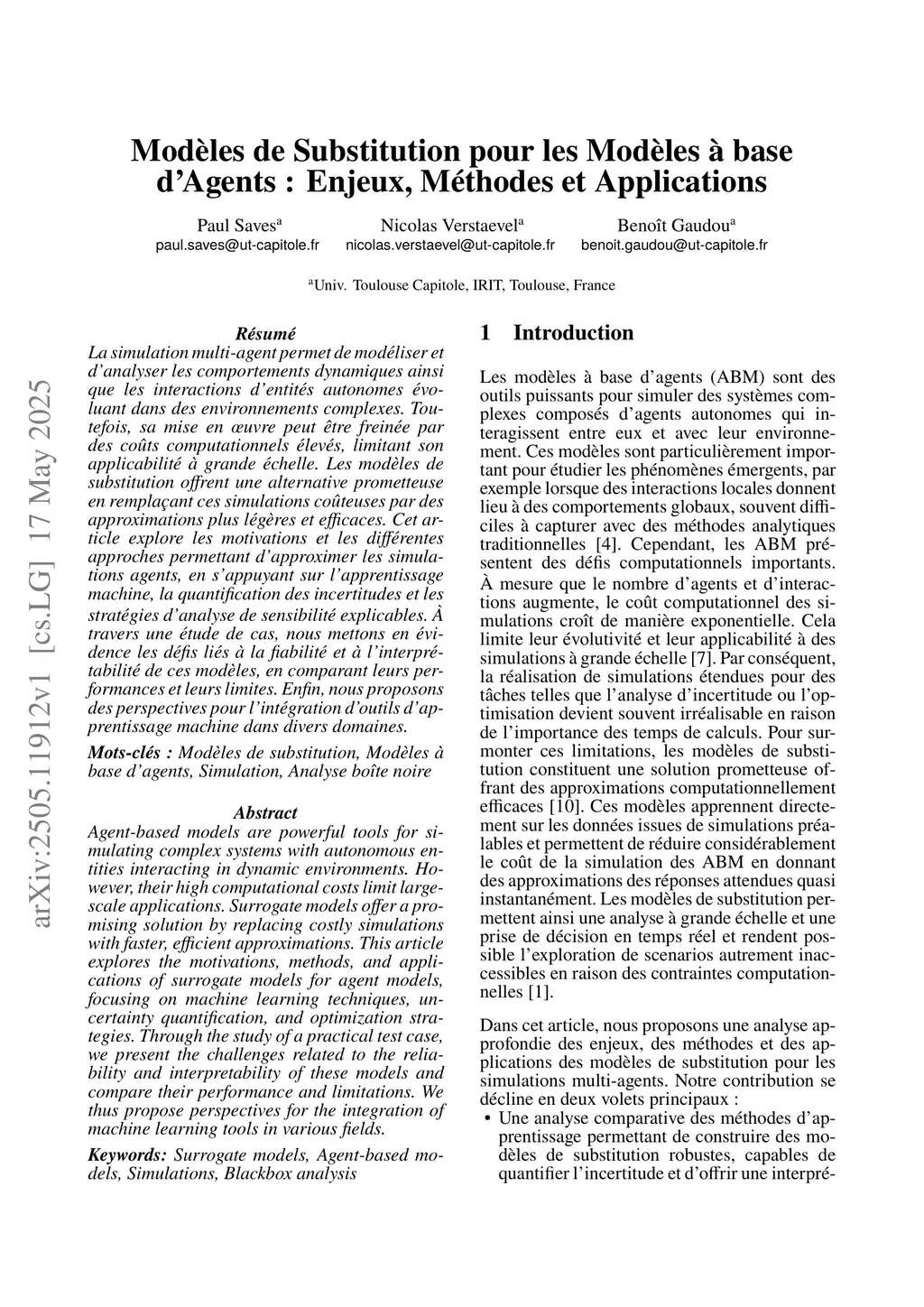 Modèles de Substitution pour les Modèles à base dÁgents : Enjeux, Méthodes et Applications