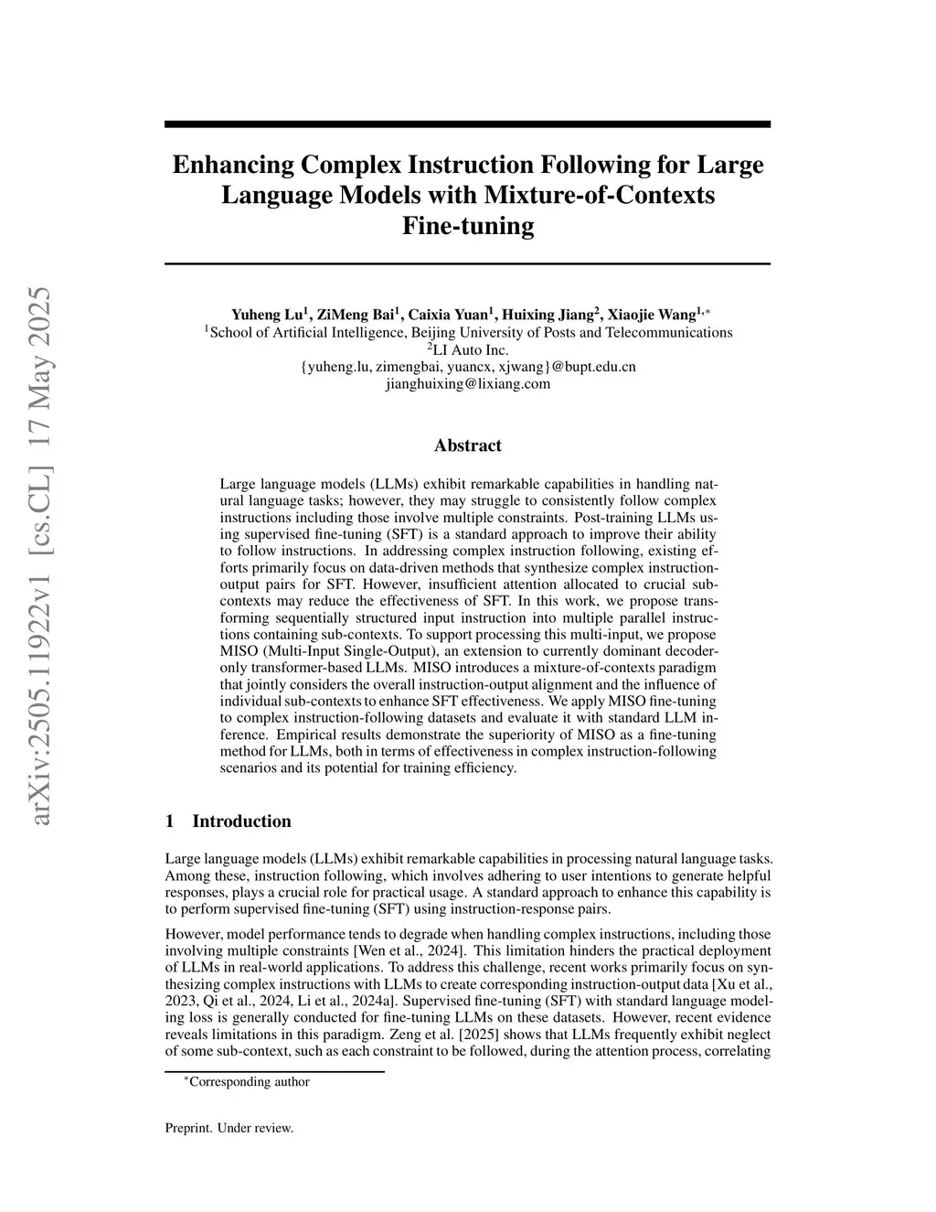 Large language models (LLMs) exhibit remarkable capabilities in handling natural language tasks; however, they may struggle to consistently follow complex instructions including those involve multiple constraints. Post-training LLMs using supervised fine-tuning (SFT) is a standard approach to improve their ability to follow instructions. In addressing complex instruction following, existing efforts primarily focus on data-driven methods that synthesize complex instruction-output pairs for SFT. However, insufficient attention allocated to crucial sub-contexts may reduce the effectiveness of SFT. In this work, we propose transforming sequentially structured input instruction into multiple parallel instructions containing subcontexts. To support processing this multi-input, we propose MISO (Multi-Input Single-Output), an extension to currently dominant decoder-only transformer-based LLMs. MISO introduces a mixture-of-contexts paradigm that jointly considers the overall instruction-output alignment and the influence of individual sub-contexts to enhance SFT effectiveness. We apply MISO fine-tuning to complex instructionfollowing datasets and evaluate it with standard LLM inference. Empirical results demonstrate the superiority of MISO as a fine-tuning method for LLMs, both in terms of effectiveness in complex instruction-following scenarios and its potential for training efficiency.