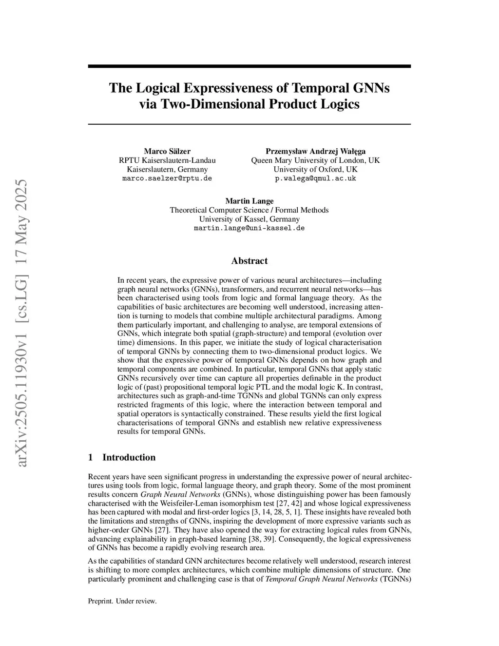 In recent years, the expressive power of various neural architectures -- including graph neural networks (GNNs), transformers, and recurrent neural networks -- has been characterised using tools from logic and formal language theory. As the capabilities of basic architectures are becoming well understood, increasing attention is turning to models that combine multiple architectural paradigms. Among them particularly important, and challenging to analyse, are temporal extensions of GNNs, which integrate both spatial (graph-structure) and temporal (evolution over time) dimensions. In this paper, we initiate the study of logical characterisation of temporal GNNs by connecting them to two-dimensional product logics. We show that the expressive power of temporal GNNs depends on how graph and temporal components are combined. In particular, temporal GNNs that apply static GNNs recursively over time can capture all properties definable in the product logic of (past) propositional temporal logic PTL and the modal logic K. In contrast, architectures such as graph-and-time TGNNs and global TGNNs can only express restricted fragments of this logic, where the interaction between temporal and spatial operators is syntactically constrained. These provide us with the first results on the logical expressiveness of temporal GNNs.