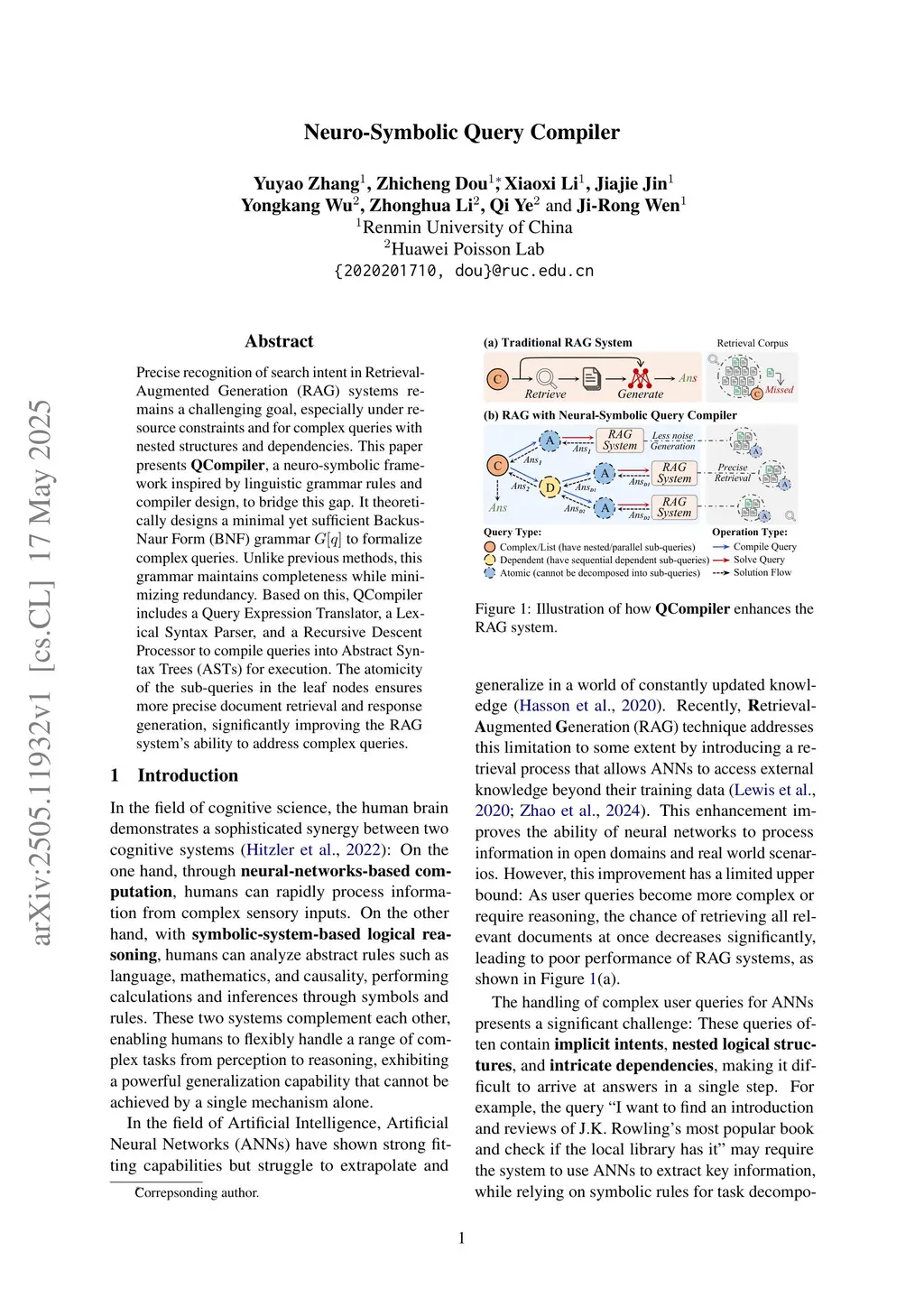 Precise recognition of search intent in Retrieval-Augmented Generation (RAG) systems remains a challenging goal, especially under resource constraints and for complex queries with nested structures and dependencies. This paper presents QCompiler, a neuro-symbolic framework inspired by linguistic grammar rules and compiler design, to bridge this gap. It theoretically designs a minimal yet sufficient Backus-Naur Form (BNF) grammar to formalize complex queries. Unlike previous methods, this grammar maintains completeness while minimizing redundancy. Based on this, QCompiler includes a Query Expression Translator, a Lexical Syntax Parser, and a Recursive Descent Processor to compile queries into Abstract Syntax Trees (ASTs) for execution. The atomicity of the sub-queries in the leaf nodes ensures more precise document retrieval and response generation, significantly improving the RAG system's ability to address complex queries.