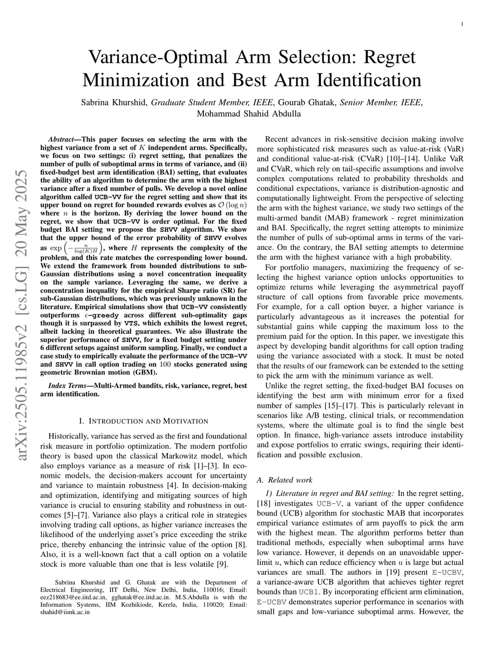 This paper focuses on selecting the arm with the highest variance from a set of independent arms. Specifically, we focus on two settings: (i) misallocation minimization setting, that penalizes the number of pulls of suboptimal arms in terms of variance, and (ii) fixed-budget best arm identification setting, that evaluates the ability of an algorithm to determine the arm with the highest variance after a fixed number of pulls. We develop a novel online algorithm called UCB-VV for the misallocation minimization (MM) and show that its upper bound on misallocation for bounded rewards evolves as where is the horizon. By deriving the lower bound on the misallocation, we show that UCB-VV is order optimal. For the fixed budget best arm identification (BAI) setting we propose the SHVV algorithm. We show that the upper bound of the error probability of SHVV evolves as , where represents the complexity of the problem, and this rate matches the corresponding lower bound. We extend the framework from bounded distributions to sub-Gaussian distributions using a novel concentration inequality on the sample variance and standard deviation. Leveraging the same, we derive a concentration inequality for the empirical Sharpe ratio (SR) for sub-Gaussian distributions, which was previously unknown in the literature. Empirical simulations show that UCB-VV consistently outperforms -greedy across different sub-optimality gaps though it is surpassed by VTS, which exhibits the lowest misallocation, albeit lacking in theoretical guarantees. We also illustrate the superior performance of SHVV, for a fixed budget setting under 6 different setups against uniform sampling. Finally, we conduct a case study to empirically evaluate the performance of the UCB-VV and SHVV in call option trading on stocks generated using GBM.