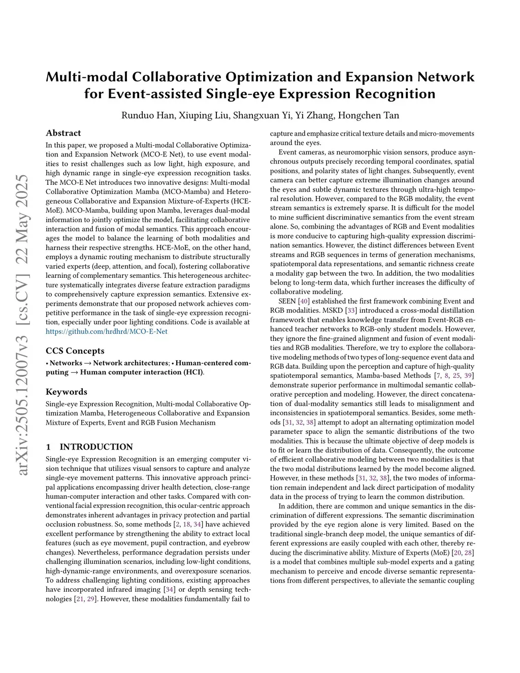 In this paper, we proposed a Multi-modal Collaborative Optimization and Expansion Network (MCO-E Net), to use event modalities to resist challenges such as low light, high exposure, and high dynamic range in single-eye expression recognition tasks. The MCO-E Net introduces two innovative designs: Multi-modal Collaborative Optimization Mamba (MCO-Mamba) and Heterogeneous Collaborative and Expansion Mixture-of-Experts (HCE-MoE). MCO-Mamba, building upon Mamba, leverages dual-modal information to jointly optimize the model, facilitating collaborative interaction and fusion of modal semantics. This approach encourages the model to balance the learning of both modalities and harness their respective strengths. HCE-MoE, on the other hand, employs a dynamic routing mechanism to distribute structurally varied experts (deep, attention, and focal), fostering collaborative learning of complementary semantics. This heterogeneous architecture systematically integrates diverse feature extraction paradigms to comprehensively capture expression semantics. Extensive experiments demonstrate that our proposed network achieves competitive performance in the task of single-eye expression recognition, especially under poor lighting conditions.
