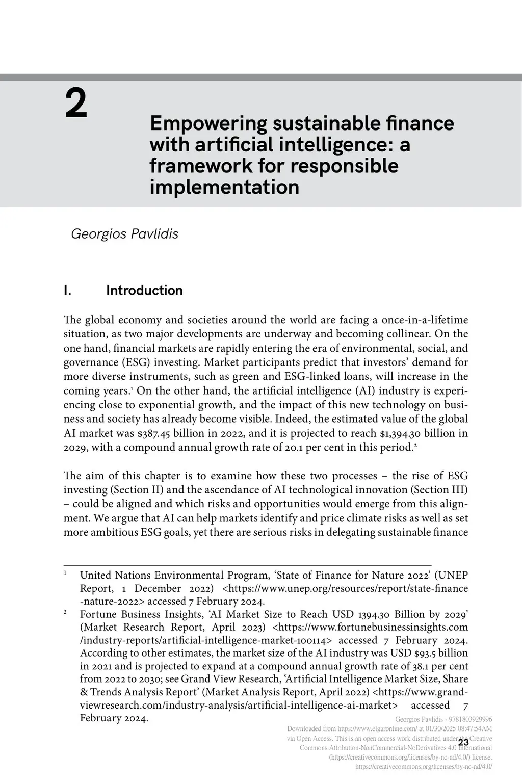 This chapter explores the convergence of two major developments: the rise of environmental, social, and governance (ESG) investing and the exponential growth of artificial intelligence (AI) technology. The increased demand for diverse ESG instruments, such as green and ESG-linked loans, will be aligned with the rapid growth of the global AI market, which is expected to be worth $1,394.30 billion by 2029. AI can assist in identifying and pricing climate risks, setting more ambitious ESG goals, and advancing sustainable finance decisions. However, delegating sustainable finance decisions to AI poses serious risks, and new principles and rules for AI and ESG investing are necessary to mitigate these risks. This chapter highlights the challenges associated with norm-setting initiatives and stresses the need for the fine-tuning of the principles of legitimacy, oversight and verification, transparency, and explainability. Finally, the chapter contends that integrating AI into ESG non-financial reporting necessitates a heightened sense of responsibility and the establishment of fundamental guiding principles within the spheres of AI and ESG investing.