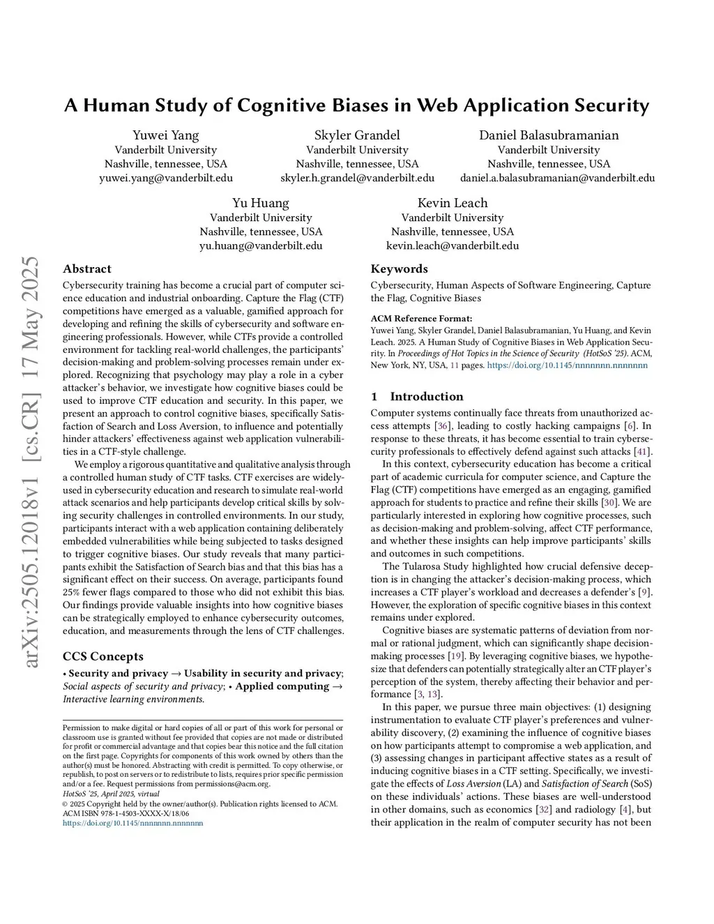 Cybersecurity training has become a crucial part of computer science education and industrial onboarding. Capture the Flag (CTF) competitions have emerged as a valuable, gamified approach for developing and refining the skills of cybersecurity and software engineering professionals. However, while CTFs provide a controlled environment for tackling real world challenges, the participants' decision making and problem solving processes remain under explored. Recognizing that psychology may play a role in a cyber attacker's behavior, we investigate how cognitive biases could be used to improve CTF education and security. In this paper, we present an approach to control cognitive biases, specifically Satisfaction of Search and Loss Aversion, to influence and potentially hinder attackers' effectiveness against web application vulnerabilities in a CTF style challenge. We employ a rigorous quantitative and qualitative analysis through a controlled human study of CTF tasks. CTF exercises are widely used in cybersecurity education and research to simulate real world attack scenarios and help participants develop critical skills by solving security challenges in controlled environments. In our study, participants interact with a web application containing deliberately embedded vulnerabilities while being subjected to tasks designed to trigger cognitive biases. Our study reveals that many participants exhibit the Satisfaction of Search bias and that this bias has a significant effect on their success. On average, participants found 25% fewer flags compared to those who did not exhibit this bias. Our findings provide valuable insights into how cognitive biases can be strategically employed to enhance cybersecurity outcomes, education, and measurements through the lens of CTF challenges.