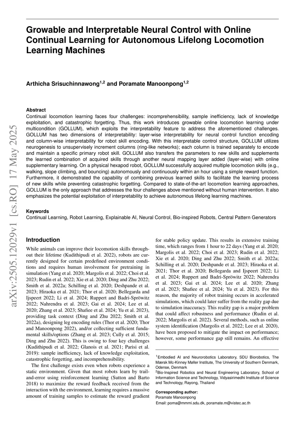 Continual locomotion learning faces four challenges: incomprehensibility, sample inefficiency, lack of knowledge exploitation, and catastrophic forgetting. Thus, this work introduces Growable Online Locomotion Learning Under Multicondition (GOLLUM), which exploits the interpretability feature to address the aforementioned challenges. GOLLUM has two dimensions of interpretability: layer-wise interpretability for neural control function encoding and column-wise interpretability for robot skill encoding. With this interpretable control structure, GOLLUM utilizes neurogenesis to unsupervisely increment columns (ring-like networks); each column is trained separately to encode and maintain a specific primary robot skill. GOLLUM also transfers the parameters to new skills and supplements the learned combination of acquired skills through another neural mapping layer added (layer-wise) with online supplementary learning. On a physical hexapod robot, GOLLUM successfully acquired multiple locomotion skills (e.g., walking, slope climbing, and bouncing) autonomously and continuously within an hour using a simple reward function. Furthermore, it demonstrated the capability of combining previous learned skills to facilitate the learning process of new skills while preventing catastrophic forgetting. Compared to state-of-the-art locomotion learning approaches, GOLLUM is the only approach that addresses the four challenges above mentioned without human intervention. It also emphasizes the potential exploitation of interpretability to achieve autonomous lifelong learning machines.