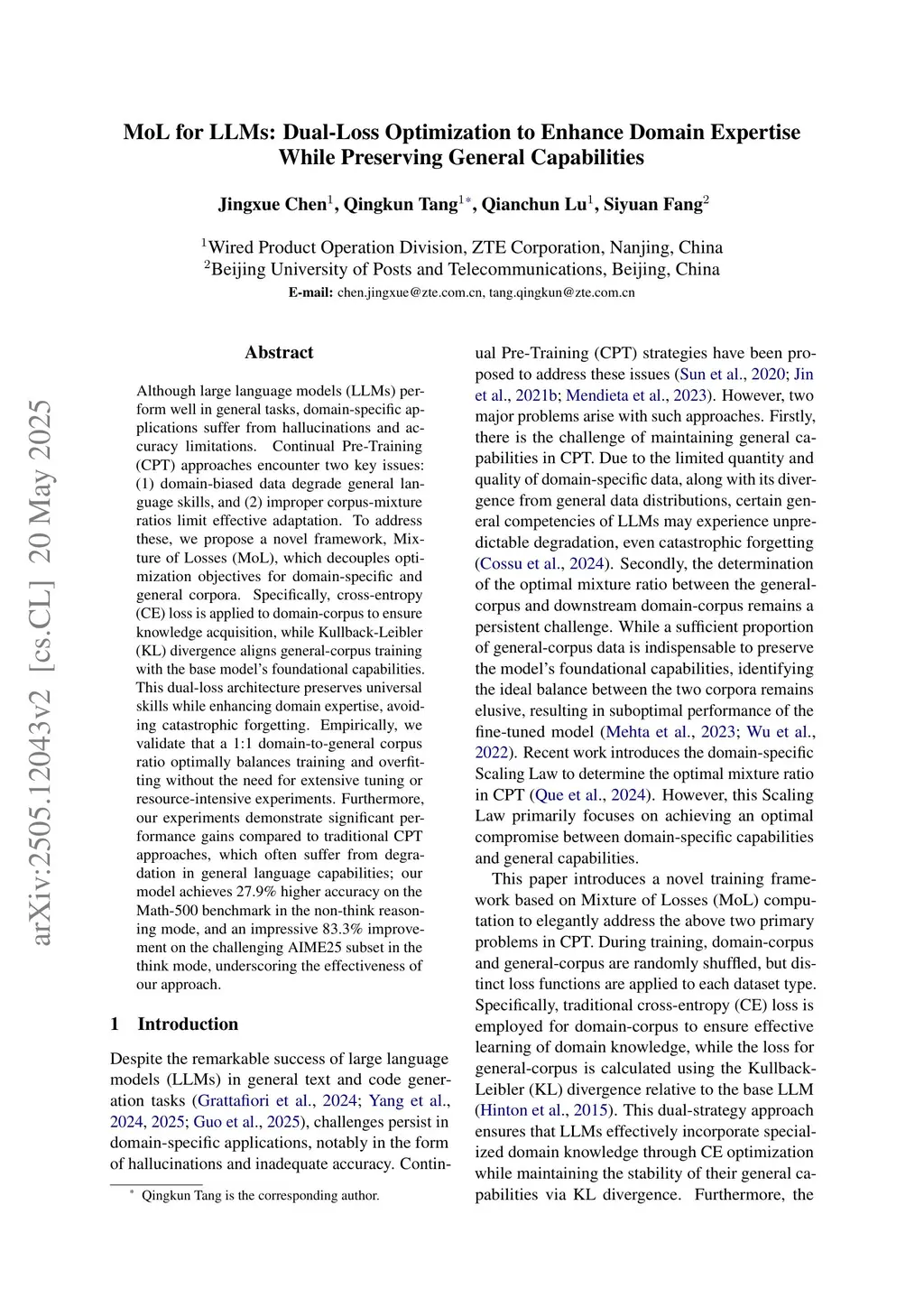 Although large language models (LLMs) perform well in general tasks, domain-specific applications suffer from hallucinations and accuracy limitations. Continual Pre-Training (CPT) approaches encounter two key issues: (1) domain-biased data degrades general language skills, and (2) improper corpus-mixture ratios limit effective adaptation. To address these, we propose a novel framework, Mixture of Losses (MoL), which decouples optimization objectives for domain-specific and general corpora. Specifically, cross-entropy (CE) loss is applied to domain-corpus to ensure knowledge acquisition, while Kullback-Leibler (KL) divergence aligns general-corpus training with the base model's foundational capabilities. This dual-loss architecture preserves universal skills while enhancing domain expertise, avoiding catastrophic forgetting. Empirically, we validate that a 1:1 domain-to-general corpus ratio optimally balances training and overfitting without the need for extensive tuning or resource-intensive experiments. Furthermore, our experiments demonstrate significant performance gains compared to traditional CPT approaches, which often suffer from degradation in general language capabilities; our model achieves 27.9% higher accuracy on the Math-500 benchmark in the non-think reasoning mode, and an impressive 83.3% improvement on the challenging AIME25 subset in the think mode, underscoring the effectiveness of our approach.