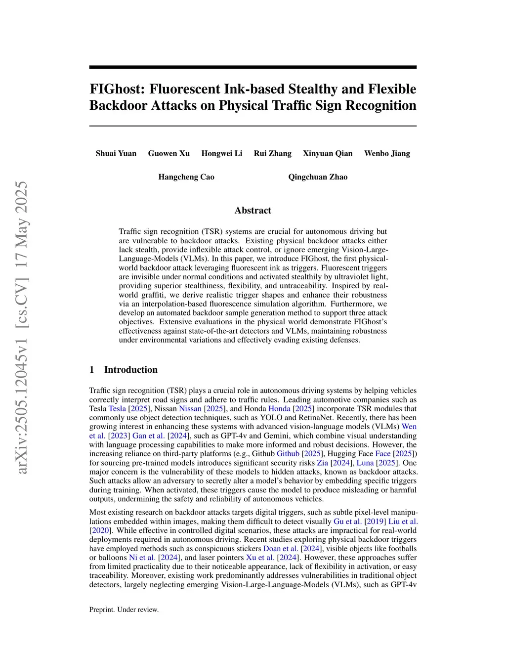 Traffic sign recognition (TSR) systems are crucial for autonomous driving but are vulnerable to backdoor attacks. Existing physical backdoor attacks either lack stealth, provide inflexible attack control, or ignore emerging Vision-Large-Language-Models (VLMs). In this paper, we introduce FIGhost, the first physical-world backdoor attack leveraging fluorescent ink as triggers. Fluorescent triggers are invisible under normal conditions and activated stealthily by ultraviolet light, providing superior stealthiness, flexibility, and untraceability. Inspired by real-world graffiti, we derive realistic trigger shapes and enhance their robustness via an interpolation-based fluorescence simulation algorithm. Furthermore, we develop an automated backdoor sample generation method to support three attack objectives. Extensive evaluations in the physical world demonstrate FIGhost's effectiveness against state-of-the-art detectors and VLMs, maintaining robustness under environmental variations and effectively evading existing defenses.