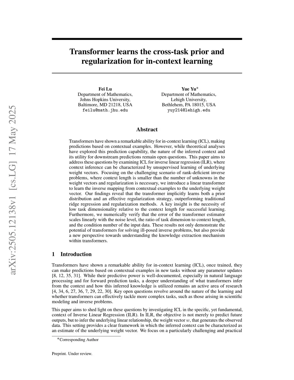 Transformers have shown a remarkable ability for in-context learning (ICL), making predictions based on contextual examples. However, while theoretical analyses have explored this prediction capability, the nature of the inferred context and its utility for downstream predictions remain open questions. This paper aims to address these questions by examining ICL for inverse linear regression (ILR), where context inference can be characterized by unsupervised learning of underlying weight vectors. Focusing on the challenging scenario of rank-deficient inverse problems, where context length is smaller than the number of unknowns in the weight vectors and regularization is necessary, we introduce a linear transformer to learn the inverse mapping from contextual examples to the underlying weight vector. Our findings reveal that the transformer implicitly learns both a prior distribution and an effective regularization strategy, outperforming traditional ridge regression and regularization methods. A key insight is the necessity of low task dimensionality relative to the context length for successful learning. Furthermore, we numerically verify that the error of the transformer estimator scales linearly with the noise level, the ratio of task dimension to context length, and the condition number of the input data. These results not only demonstrate the potential of transformers for solving ill-posed inverse problems, but also provide a new perspective towards understanding the knowledge extraction mechanism within transformers.