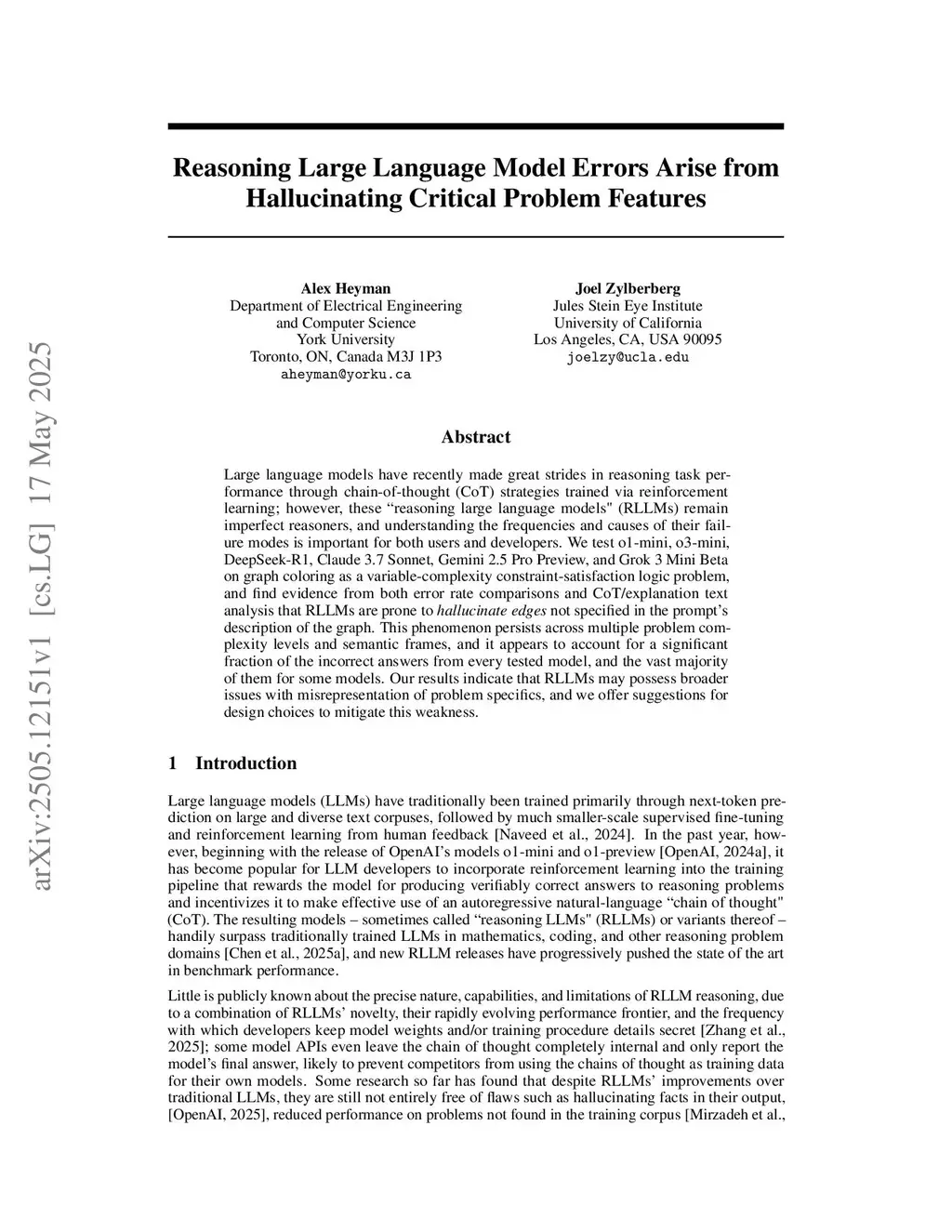 Large language models have recently made great strides in reasoning task performance through chain-of-thought (CoT) strategies trained via reinforcement learning; however, these "reasoning large language models" (RLLMs) remain imperfect reasoners, and understanding the frequencies and causes of their failure modes is important for both users and developers. We test o1-mini, o3-mini, DeepSeek-R1, Claude 3.7 Sonnet, Gemini 2.5 Pro Preview, and Grok 3 Mini Beta on graph coloring as a variable-complexity constraint-satisfaction logic problem, and find evidence from both error rate comparisons and CoT/explanation text analysis that RLLMs are prone to hallucinate graph edges not specified in the prompt. This phenomenon persists across multiple problem complexity levels and semantic frames, and it appears to account for a significant fraction of the incorrect answers from every tested model, and the vast majority of them for some models. We also validate the generalizability of this input-conflicting hallucination phenomenon with smaller-scale experiments on a type of stable matching problem. Our results indicate that RLLMs may possess broader issues with misrepresentation of problem specifics, and we offer suggestions for design choices to mitigate this weakness.