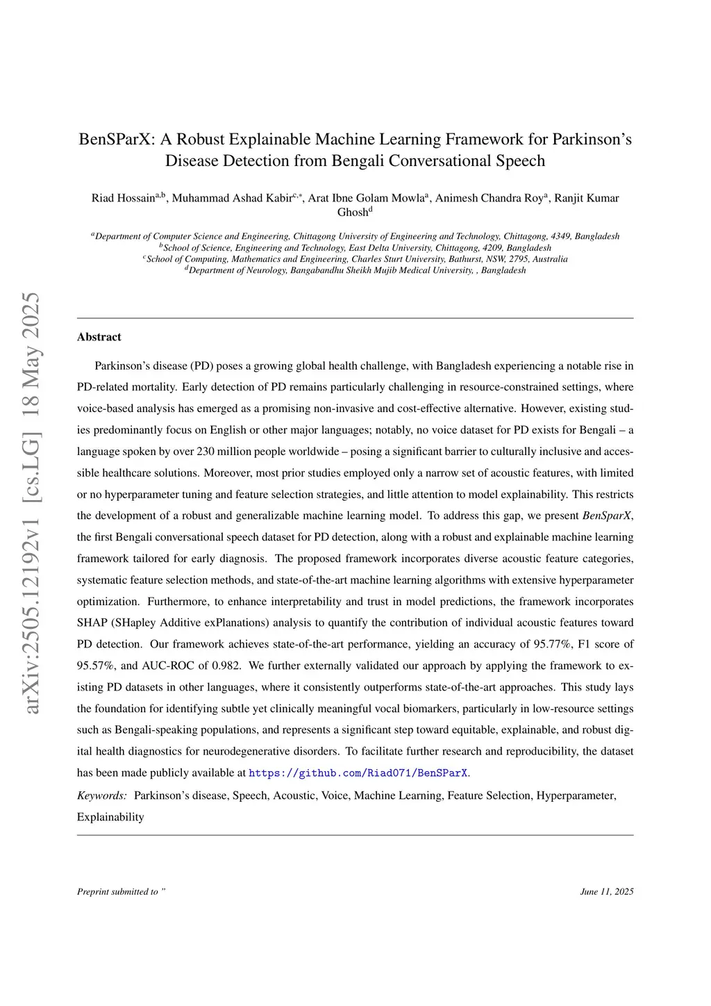 Parkinson's disease (PD) poses a growing global health challenge, with Bangladesh experiencing a notable rise in PD-related mortality. Early detection of PD remains particularly challenging in resource-constrained settings, where voice-based analysis has emerged as a promising non-invasive and cost-effective alternative. However, existing studies predominantly focus on English or other major languages; notably, no voice dataset for PD exists for Bengali - posing a significant barrier to culturally inclusive and accessible healthcare solutions. Moreover, most prior studies employed only a narrow set of acoustic features, with limited or no hyperparameter tuning and feature selection strategies, and little attention to model explainability. This restricts the development of a robust and generalizable machine learning model. To address this gap, we present BenSparX, the first Bengali conversational speech dataset for PD detection, along with a robust and explainable machine learning framework tailored for early diagnosis. The proposed framework incorporates diverse acoustic feature categories, systematic feature selection methods, and state-of-the-art machine learning algorithms with extensive hyperparameter optimization. Furthermore, to enhance interpretability and trust in model predictions, the framework incorporates SHAP (SHapley Additive exPlanations) analysis to quantify the contribution of individual acoustic features toward PD detection. Our framework achieves state-of-the-art performance, yielding an accuracy of 95.77%, F1 score of 95.57%, and AUC-ROC of 0.982. We further externally validated our approach by applying the framework to existing PD datasets in other languages, where it consistently outperforms state-of-the-art approaches. To facilitate further research and reproducibility, the dataset has been made publicly available atthis https URL.