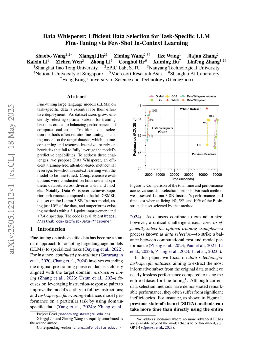 Fine-tuning large language models (LLMs) on task-specific data is essential for their effective deployment. As dataset sizes grow, efficiently selecting optimal subsets for training becomes crucial to balancing performance and computational costs. Traditional data selection methods often require fine-tuning a scoring model on the target dataset, which is time-consuming and resource-intensive, or rely on heuristics that fail to fully leverage the model's predictive capabilities. To address these challenges, we propose Data Whisperer, an efficient, training-free, attention-based method that leverages few-shot in-context learning with the model to be fine-tuned. Comprehensive evaluations were conducted on both raw and synthetic datasets across diverse tasks and models. Notably, Data Whisperer achieves superior performance compared to the full GSM8K dataset on the Llama-3-8B-Instruct model, using just 10% of the data, and outperforms existing methods with a 3.1-point improvement and a 7.4 speedup. The code is available atthis https URL.