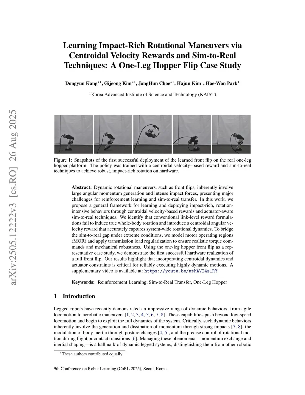 Dynamic rotational maneuvers, such as front flips, inherently involve large angular momentum generation and intense impact forces, presenting major challenges for reinforcement learning and sim-to-real transfer. In this work, we propose a general framework for learning and deploying impact-rich, rotation-intensive behaviors through centroidal velocity-based rewards and actuator-aware sim-to-real techniques. We identify that conventional link-level reward formulations fail to induce true whole-body rotation and introduce a centroidal angular velocity reward that accurately captures system-wide rotational dynamics. To bridge the sim-to-real gap under extreme conditions, we model motor operating regions (MOR) and apply transmission load regularization to ensure realistic torque commands and mechanical robustness. Using the one-leg hopper front flip as a representative case study, we demonstrate the first successful hardware realization of a full front flip. Our results highlight that incorporating centroidal dynamics and actuator constraints is critical for reliably executing highly dynamic motions. A supplementary video is available at:this https URL