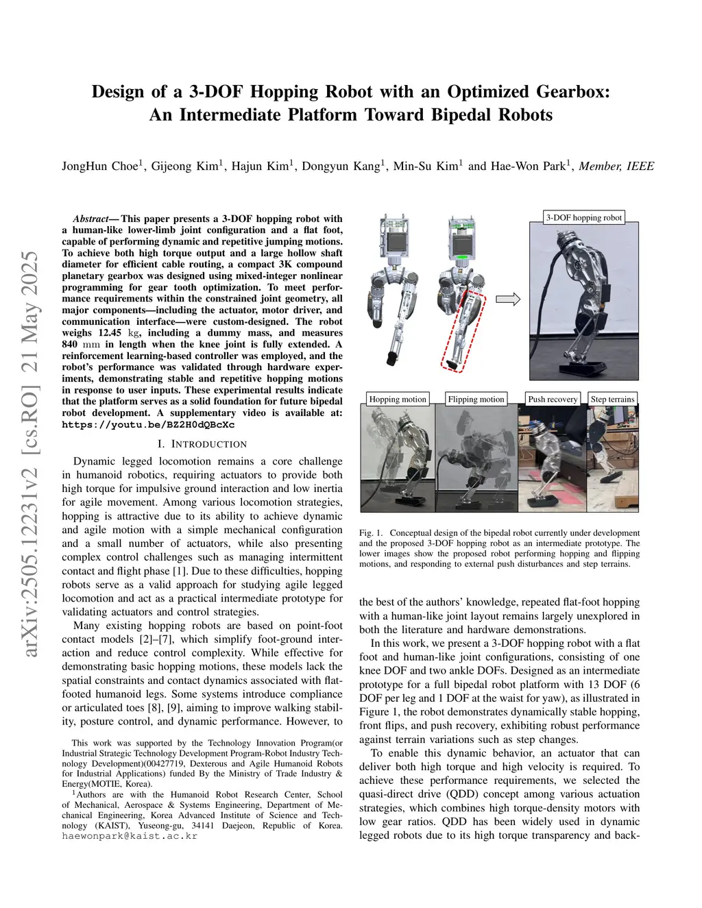 This paper presents a 3-DOF hopping robot with a human-like lower-limb joint configuration and a flat foot, capable of performing dynamic and repetitive jumping motions. To achieve both high torque output and a large hollow shaft diameter for efficient cable routing, a compact 3K compound planetary gearbox was designed using mixed-integer nonlinear programming for gear tooth optimization. To meet performance requirements within the constrained joint geometry, all major components-including the actuator, motor driver, and communication interface-were custom-designed. The robot weighs 12.45 kg, including a dummy mass, and measures 840 mm in length when the knee joint is fully extended. A reinforcement learning-based controller was employed, and robot's performance was validated through hardware experiments, demonstrating stable and repetitive hopping motions in response to user inputs. These experimental results indicate that the platform serves as a solid foundation for future bipedal robot development.